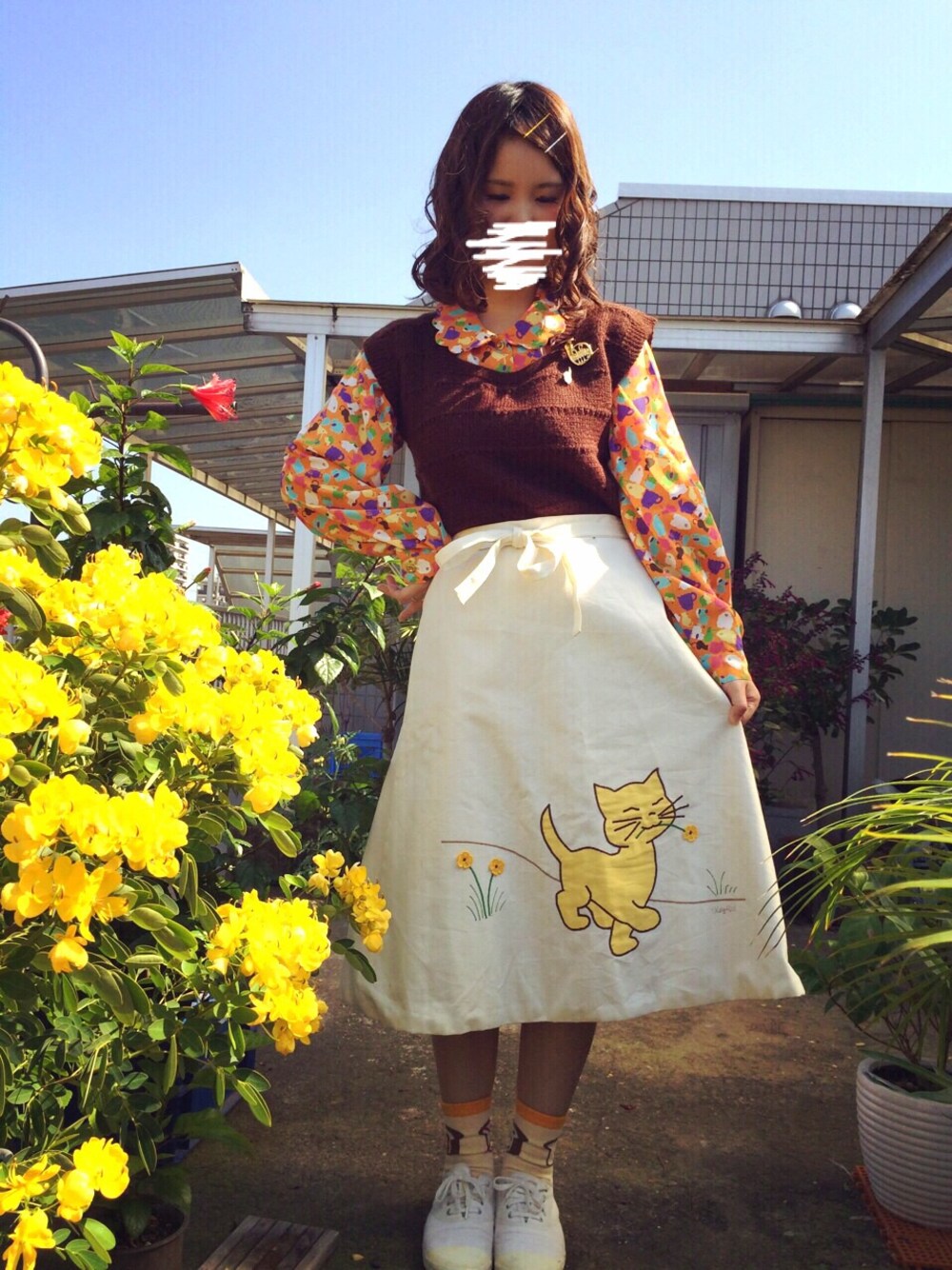 動物だらけです 笑 ポイントは動物です ← ねこの巻きスカートは 沖縄の古着屋で買いました ** ブローチはホルンを吹こぉと してるアヒルちゃんですね ⚫︎´ `⚫︎ 靴下はパン部!! 夏くらいに買ったのだけど 生地が厚くてなかなか履けず, やっと履く季節がきました ♪♪