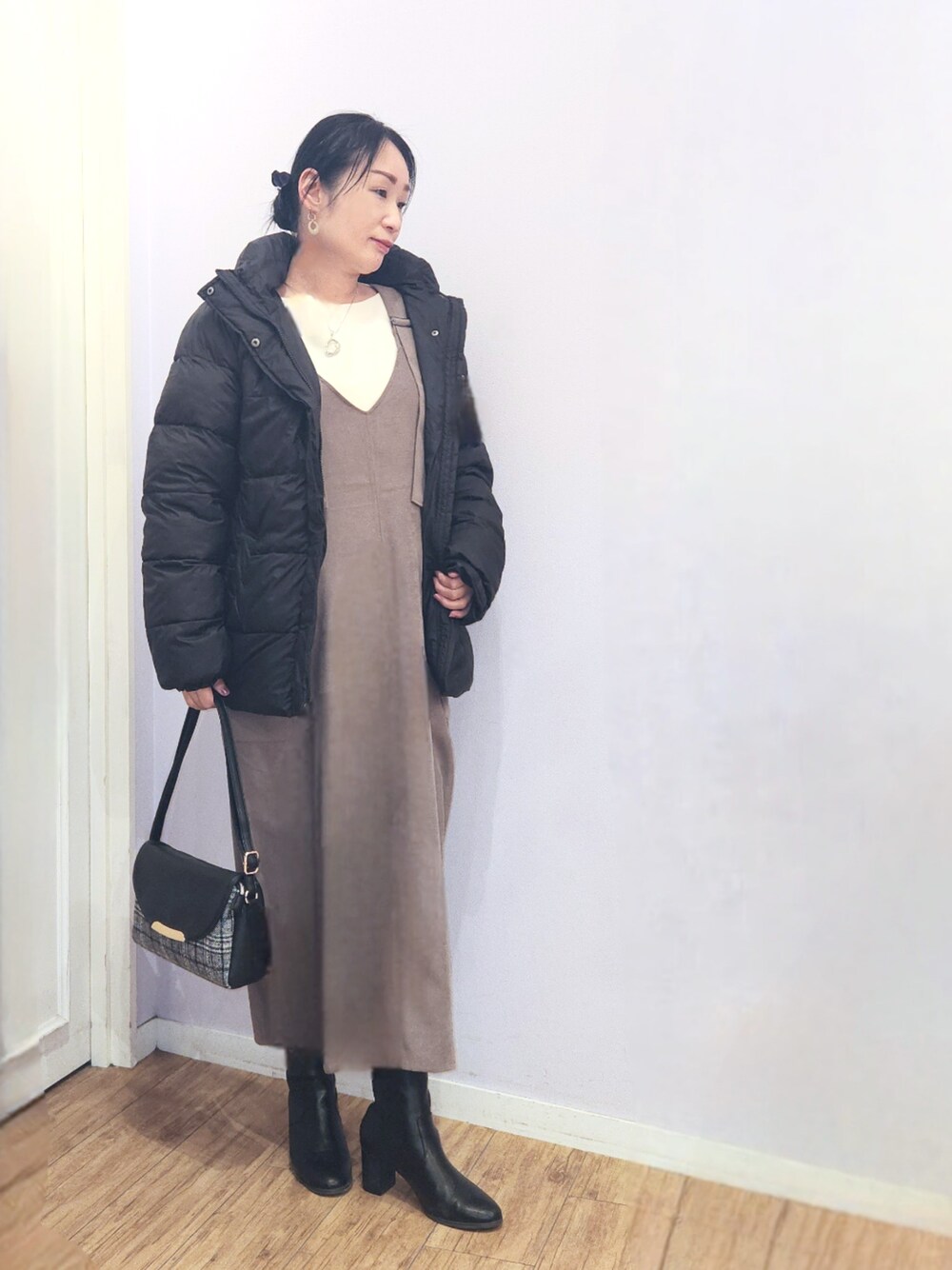 ☆サイズ感 中綿ジャケットはスタンドカラーの程よいサイズ感で、立体感のあるスタンドカラーデザインが顔回りをすっきりとみせてくれます✨ ジャンスカは、Vネック風のデザインで胸元をスッキリ見せてくれ、楽チンなのに体系カバーも叶いますよ♪ インナーは、ドルマンスリーブで腕周りにゆとりがあり、お袖口と裾はきゅっとしまったサイズ感で、ゆったりめのシルエットを適度に引き締めてくれます お袖口のパール調ボタンとスリットデザインも可愛いポイント✨ ☆素材感・着心地 中綿ジャケットは、ふんわりと柔らかく軽いのに暖かく、着心地が良いのが嬉しいポイント。 表地は生地の特性で急な雨などもはじきやすくなっていますよ✨ ジャンスカは、少し凹凸感のあるツイル素材を使用 インナーは、肌触りの良いニット素材 レーヨン混の柔らかくもちもちとした素材 ☆おすすめポイント 中綿ジャケットは、どんなスタイリングにも合わせやすいミドル丈で様々なアイテムと合わせやすく、ポケットに手を入れたとき、手の甲があたる部分にフリースを使用しているので、手を入れた瞬間から暖かいのも嬉しいポイント♪