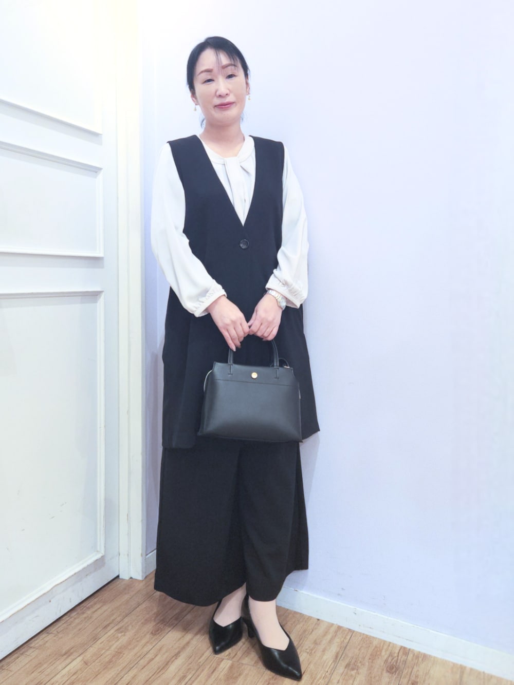 ☆サイズ感 ジレは、縦ラインを強調したIライン、開けても閉めてもきれいに決まる深めVネックライン、ポケットはシーム(脇の切り替え部分)仕様で長すぎず短すぎない着丈で体型をすっぽり隠してくれるのがうれしいポイント♪ 1枚羽織るだけで今年らしさとこなれ感が出せるアイテム✨ ブラウスは、程良いサイズ感で、フロント部分をタックテクニックでボウのように仕立て、縦ラインを強調しているので顔周りが上品できれいに見えるデザイン✨ パンツは、伸縮性があるので楽な穿き心地のきれいめワイドパンツ✨ 適度なゆとりがありながらも、脚がきれいに見えるシルエットで、ウエストの後ろ部分はゴム仕様になっており、前はファスナーなしのプルオンタイプなので、締め付け感なくサッと穿いていただけます♪ ☆素材感・着心地 ジレは、上品なシボ感とさらりとした肌触りで伸縮性があり、シワが目立ちにくいドレープが魅力のジャージ素材※裏地なし ブラウスは、さらりとした肌触り、とろみ感があるポリエステル素材を使用✨ パンツは、上品なシボ感とさらりとした肌触り、ドレープが魅力のジャージ素材 裏がサラサラで肌当たりよく、シワも目立ちにくく、長時間の着用でも外観変化が少ないため上品できれいな佇まいが続きます。※裏地なし ☆おすすめポイント パンツにもスカートにも合わせやすく、ワンピースの上にサッと羽織っても◎