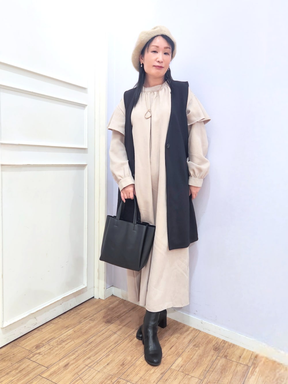☆サイズ感 ジレは、縦ラインを強調したIライン、開けても閉めてもきれいに決まる深めVネックライン、ポケットはシーム(脇の切り替え部分)仕様で長すぎず短すぎない着丈で体型をすっぽり隠してくれるのがうれしいポイント♪ 1枚羽織るだけで今年らしさとこなれ感が出せるアイテム✨ ワンピースは、お袖にフリルを施しバンドカラーデザインで、程よいボリューム感のあるフレアシルエットが大人かわいい✨ ギャザーを入れたパフ袖のデザインもほんのり甘いポイント♪ ☆素材感・着心地 ジレは、上品なシボ感とさらりとした肌触りで伸縮性があり、シワが目立ちにくいドレープが魅力のジャージ素材※裏地なし ワンピースは、微起毛させた柔らかく着心地の良い素材 ☆おすすめポイント ジレは、パンツにもスカートにも合わせやすく、ワンピースの上にサッと羽織っても◎