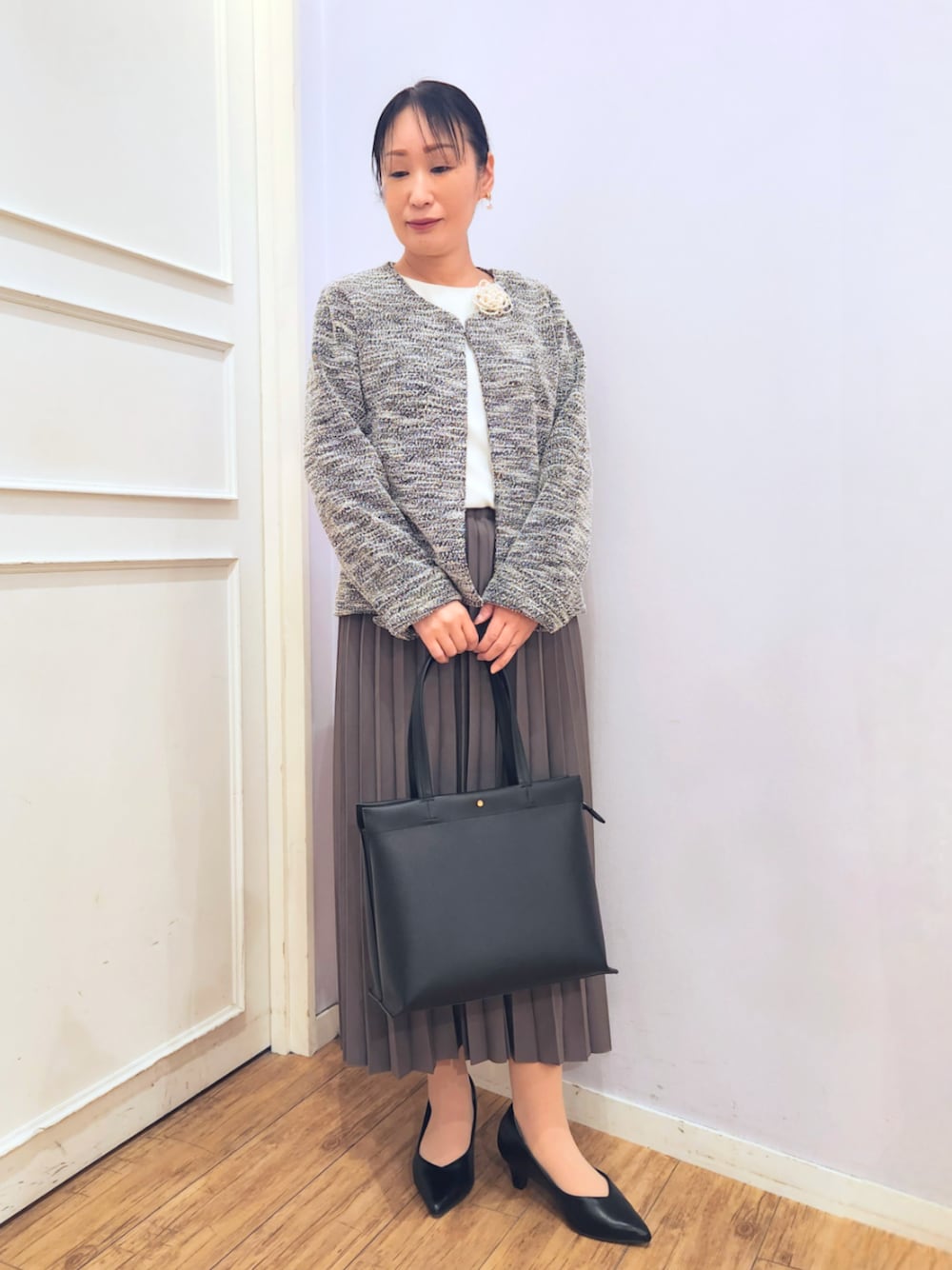ジャケットは、柔らかいタッチ、着ても持っても軽い、伸縮性あるカットツイード素材を使用した楽に着られジャケット♪ スカート・ワンピース・パンツにも合わせやすい丈感、適度なゆとりがありながらもコンパクトに見えるシルエットがポイント✨ ブラウスは、フロントのタックが上品なシンプルなブラウスで、前身頃はバルーン仕様でふんわり女性らしく、透けにくい工夫と体型カバーの効果✨ スカートは、軽やかな動きと優雅さを演出する、プリーツスカート♪ 柔らかく、しなやかで着心地も快適なパウダーツイル素材のウエスト部分はゴム仕様で、リラックスしたフィット感✨ 着脱も簡単で、スタイルを選ばず自由にコーディネートできますよ♪ ☆素材感・着心地 ジャケットは、柔らかいタッチ、軽くて着心地の良く、上品なミックス感あるカットツイード素材を使用✨ ブラウスは、落ち感のあるなめらかなポリエステル素材で、きれいめブラウス素材でお仕事にもぴったり♪ ブラウスは、さらりとした肌触り、とろみ感あるブラウス素材 ※身頃部分のみ裏地あり スカートは、柔らかなパウダーツイルの素材を使用 ☆おすすめポイント ブラウスは、ボトムにウエストインしなくても簡単にすっきり決まる、大人の女性に嬉しい着回しが利くアイテム♪