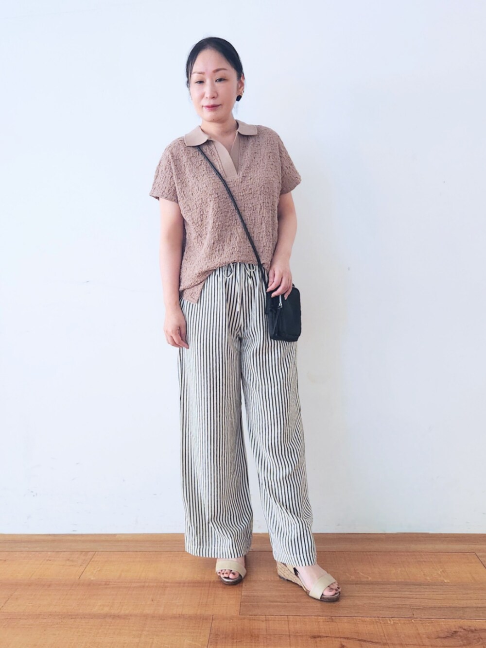 ☆サイズ感 トップスは、女性らしさのあるフレンチスリーブとスキッパーネック、柔らかな表面感の素材が特徴で、1枚で着映えるアイテム✨ シボシボとした素材はシワも気になりにくく着やすいのが嬉しいポイント♪ パンツは、清涼感のあるサッカーストライプのイージーパンツ✨ ウエストにドロスト紐が付いているのでトップスをタックインしてもサマになるデザイン ワイドストレートシルエットで使いやすいシルエット♪ ☆素材感・着心地 トップスは、シボシボとしたやわらかいジャージ素材✨ パンツは、凹凸感が特徴のサッカーストライプ素材✨ 清涼感のある素材感で、接触冷感と吸水速乾の機能付き ※ポケットあり・ウエスト総ゴム・裏地なし ☆おすすめポイント パンツは、同素材のシャツジャケットとセットアップで着用可能(256-42003) 夏らしい清涼感のある素材感のセットアップで、トレンド感もあるアイテム✨ パンツ単品でも、いろんなトップスと合わせやすいデザイン♪