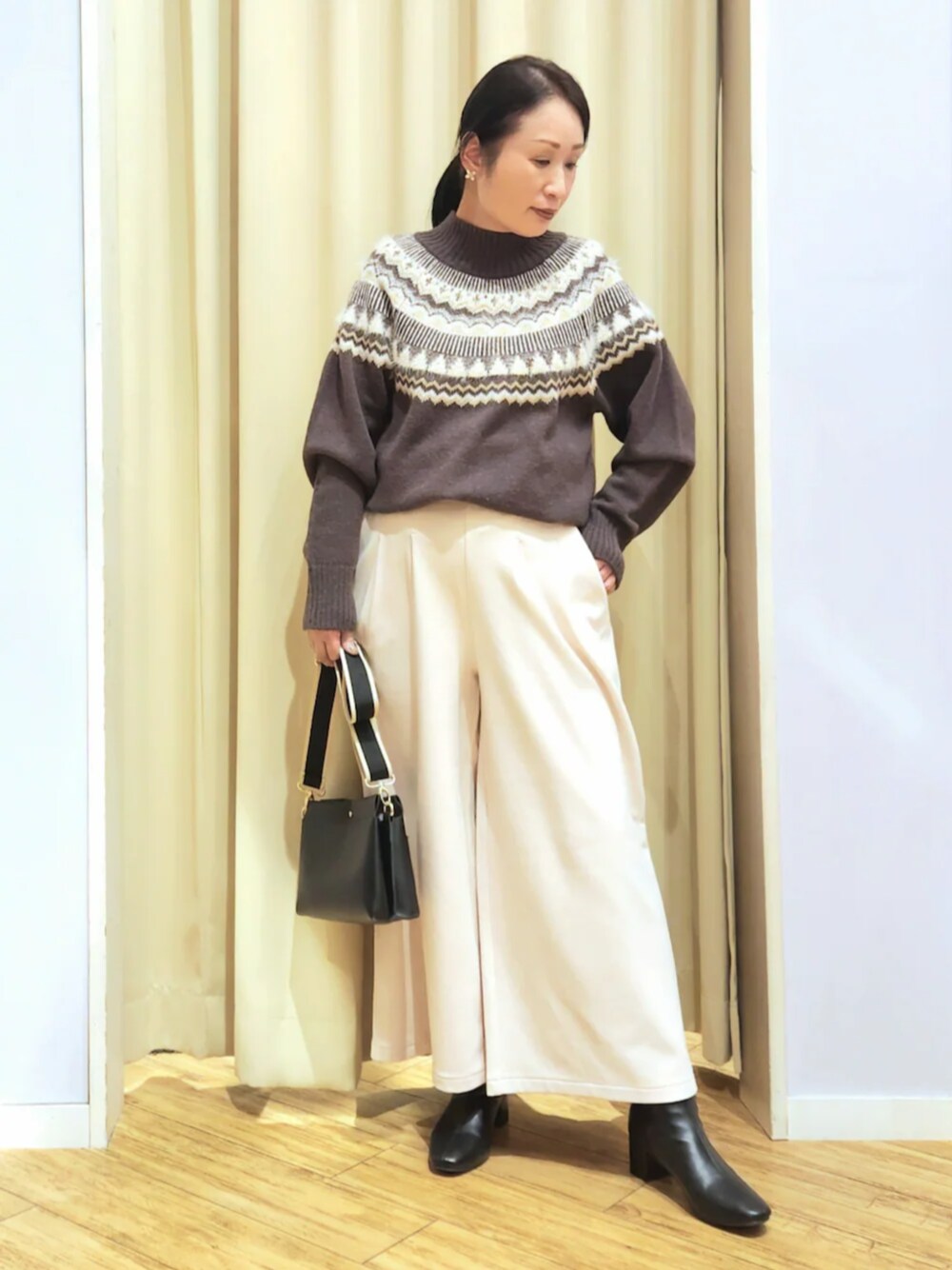 ☆サイズ感 トップスは、長すぎず短すぎずの着丈で首元がすっきり見えるハイネック、フェザーヤーンをミックスした大人っぽい配色使い、程よくゆとりのあるシルエット✨ パンツは、たっぷりタックが入ったデザインでゆったりと楽に穿いていただけウエストの後ろ部分はゴム入りで着脱しやすく、フィット感のある穿き心地✨ レギュラー丈・ショート丈の2丈から選べ、ショート丈は、10cm短い丈となります ※着用は、ショート丈 ☆素材感・着心地 トップスは、温かみある糸でざっくり編み立てたニット素材で一部の柄にシャギー糸を入れてアクセントに✨ パンツは、もちもちと伸縮性のある肌触りの良いジャージ素材で起毛素材を使用しており暖かい穿き心地✨ ※ポケット数あり・ウエスト後ろゴム・裏地なし ☆おすすめポイント トップスは、顔回りに柄があるのでアクセ要らずの時短でコーデが決まります♪ ※ブーツは、私物です