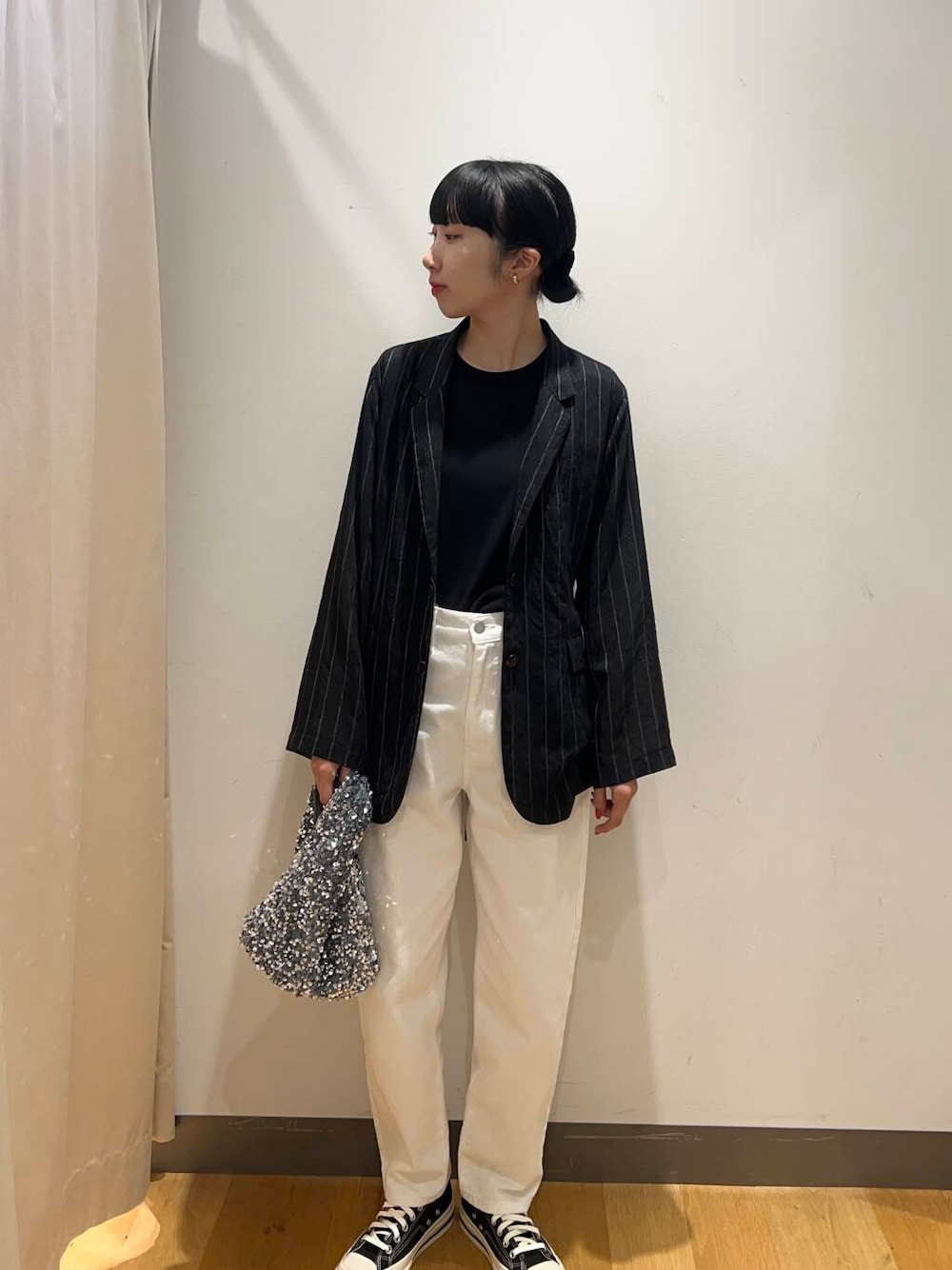 ご覧いただきありがとうございます🌝 オン・オフどちらにも対応できる、ストライプジャケットを使ったコーディネートです。今回はホワイトのデニムを合わせて抜け感のある着こなしにしてみました。 ☑︎ジャケット 肩周りや袖に程よくゆとりがあるため、リラックスして着られる一着。ブラックのスラックスを合わせて、ワントーンでまとめるのもおすすめです。 ☑︎インナー シンプルなノースリーブのカットソー。 UV CUT機能付きで 、ジャケットを脱いでもすっきり決まるデザインです。 ☑︎デニム サイズ36を着用しています(34~38と3サイズ展開)。 テーパードですっきり見えのデニムです。 シーンや好みに合わせて、サイズ選びをお楽しみください。 ☑︎スニーカー スクエアトゥがポイントのコンバース。 カジュアルながらもスタイリッシュな印象に。個人的にもお気に入りの一足で、心ときめきました❣️ 是非店頭でご覧ください👒