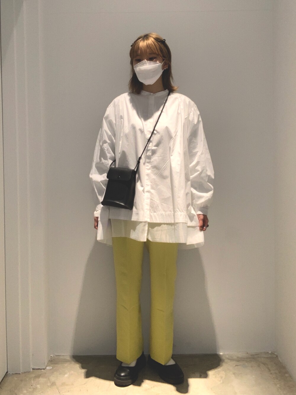 ブラウスの広がりがカワイイです💌 イエローのカラーパンツとの合わせが春っぽいです🌸