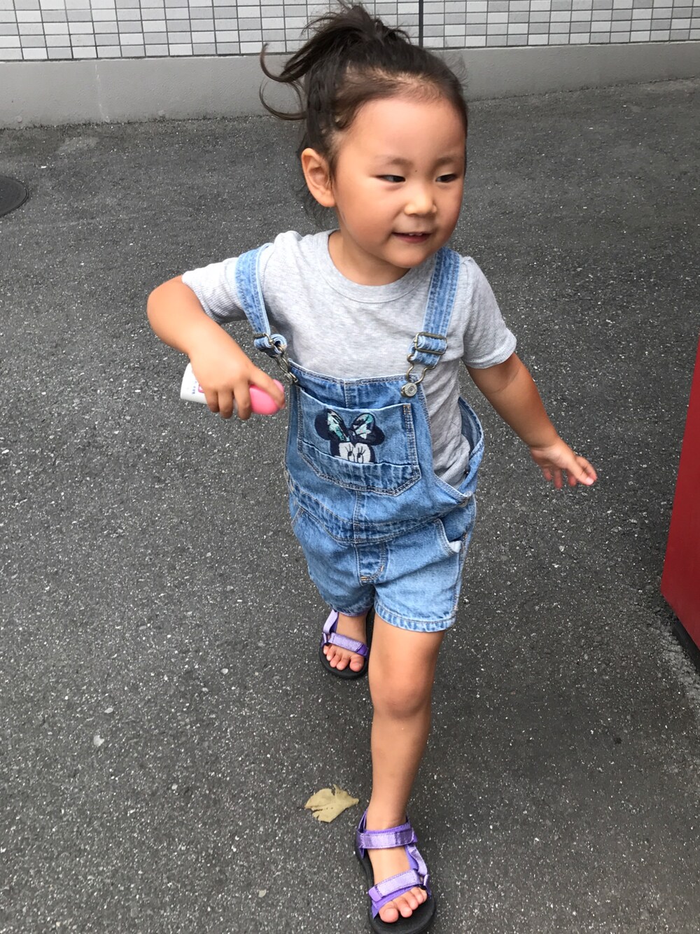 どこのか忘れた無地Tにお気に入りのミニーちゃんサロペット🎵 熱くてスニーカーも履きたがらないからtevaのサンダルが大活躍の夏🌻