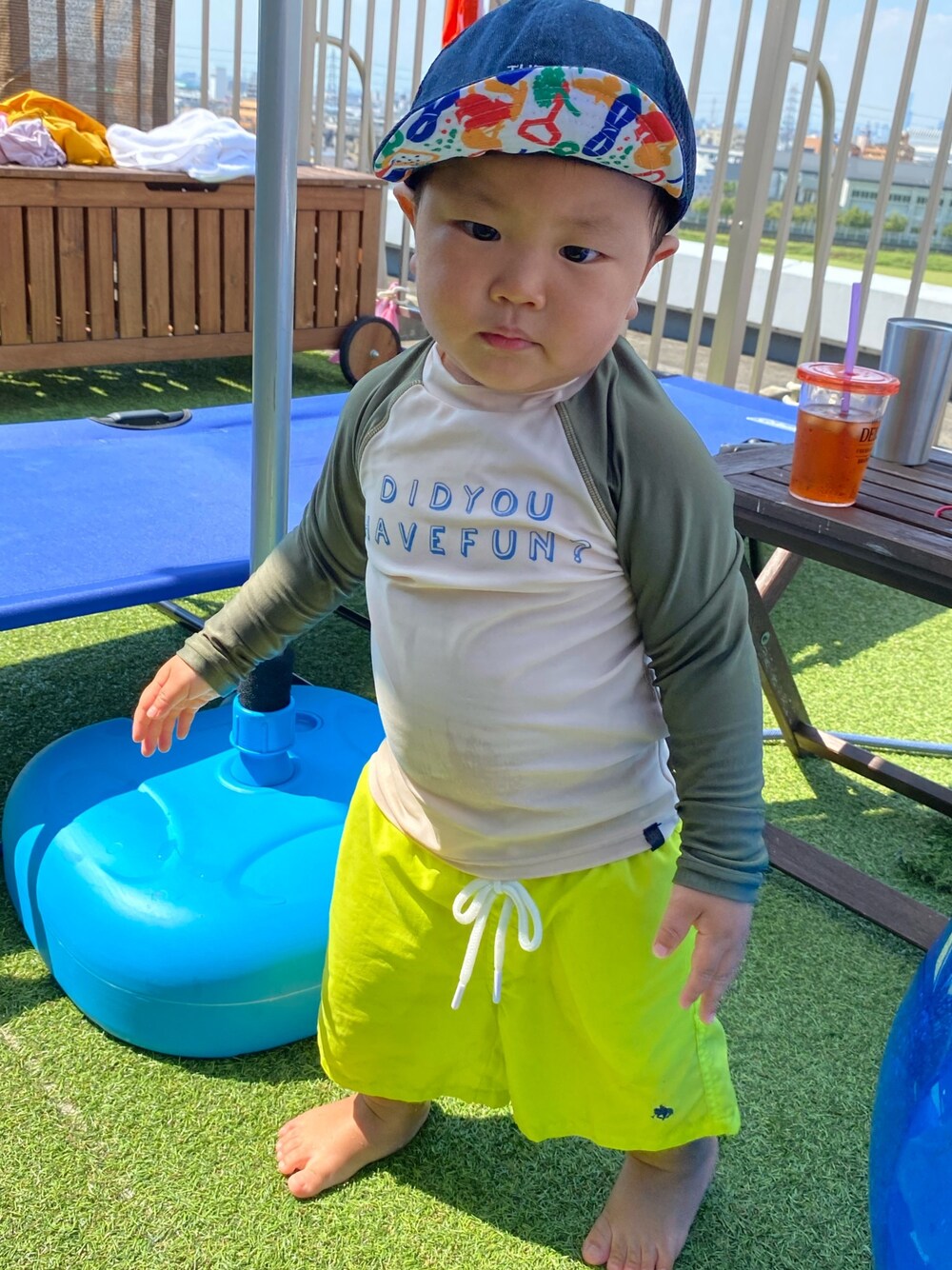 ネオンイエローの海パンがポイント⭐️ カーキ とイエローが好きな感じ♡