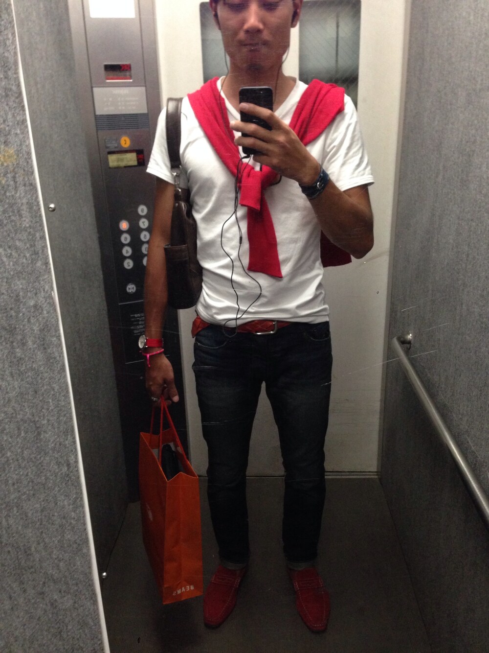 シンプルなコーディネートに、赤でアクセントを加えてみました。赤すぎるか?笑