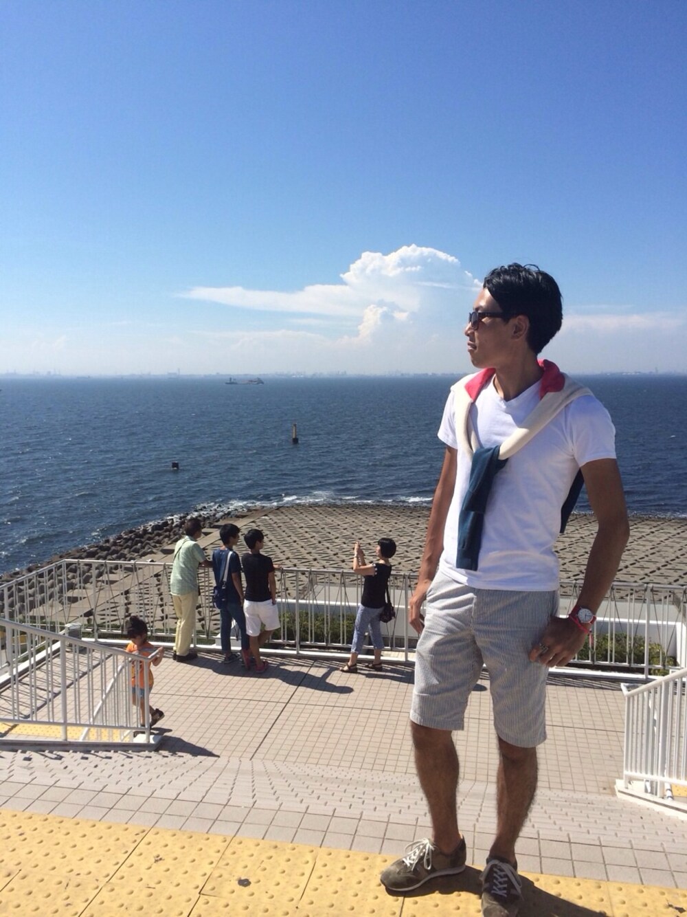 白シャツ➕シアサッカーのハーフパンツ。 ボーダーのニットでアクセントを付けつつ、足元にはカモフラージュのスニーカーでリラックス感を出しました。