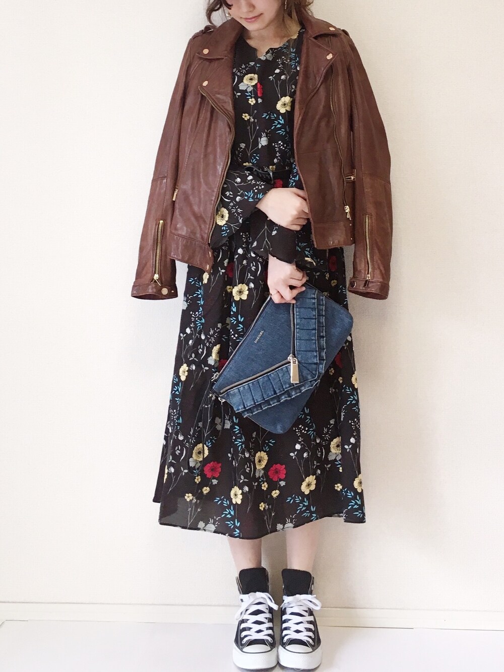 まるちわのワンピース「ベルスリーブウエストギャザーフラワーワンピース」を使ったコーディネート
