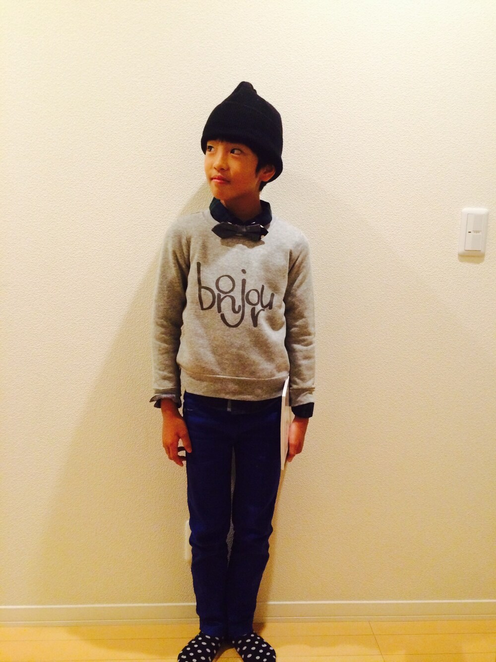 ニットキャップ…無印 スゥェット…kids UPTEMPO ボンジュールシリーズ 蝶タイ…カムチャット ネルシャツ…kids UPTEMPO パンツ…kids UPTEMPO ソックス…kids UPTEMPO ノート…コクヨ