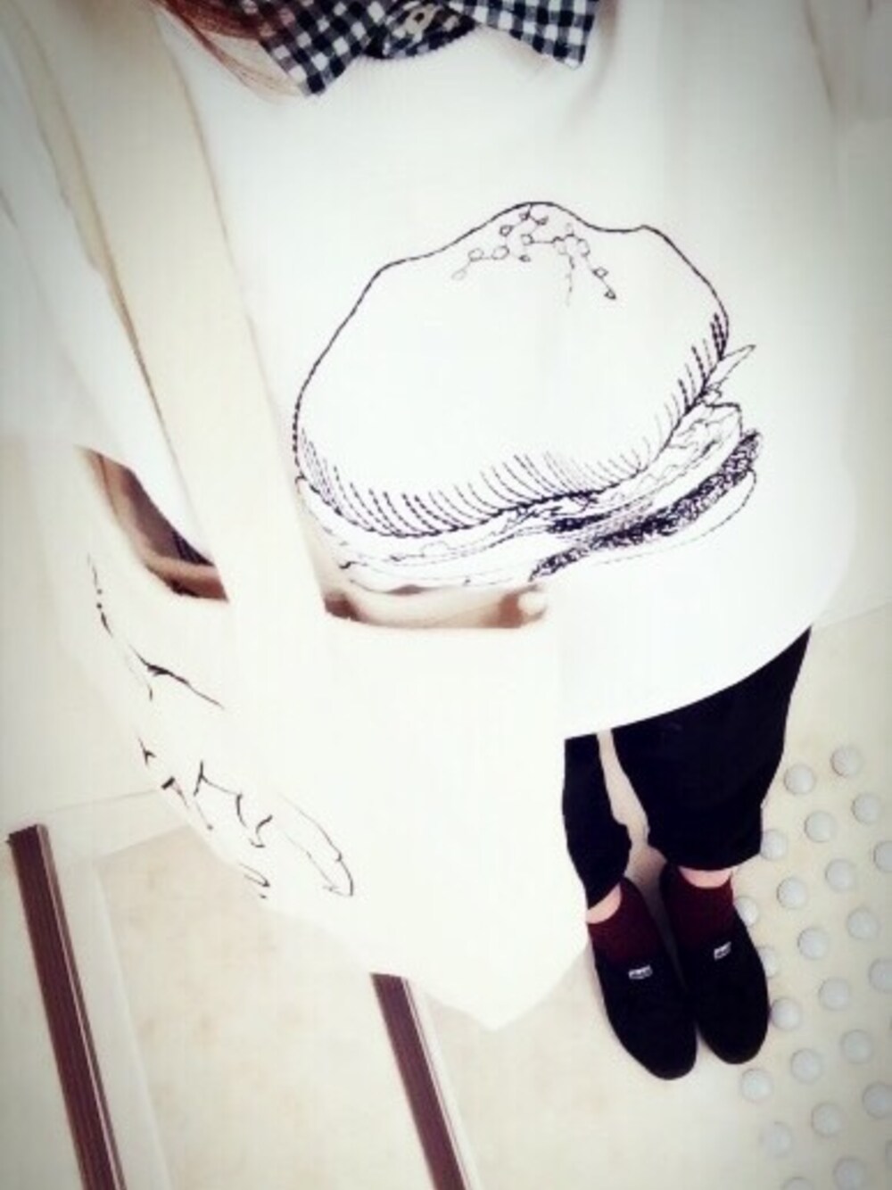 ハンバーガーのスウェットに、 らくちんのびのびパンツ。 スニーカーは 韓国で買ったお気に入り!