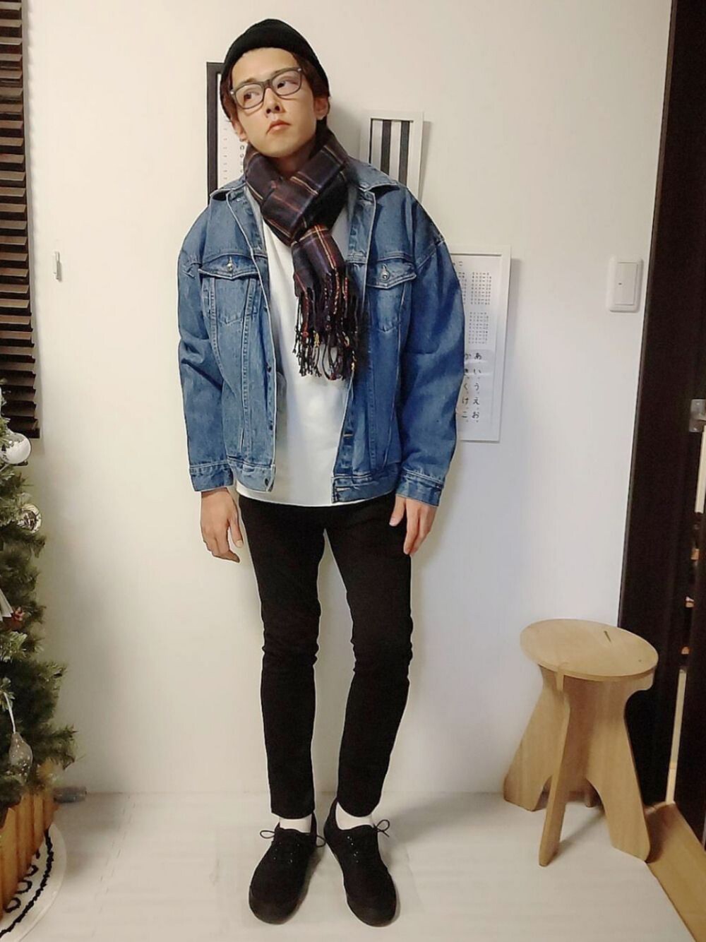 オーバーサイズのニコアンドのデニムジャケットを着たくてコーデ組みました‼️ やっぱりスキニーは何にでも合いますね🎵 モノトーン➕1色で‼️チェックのマフラー合わせました‼️