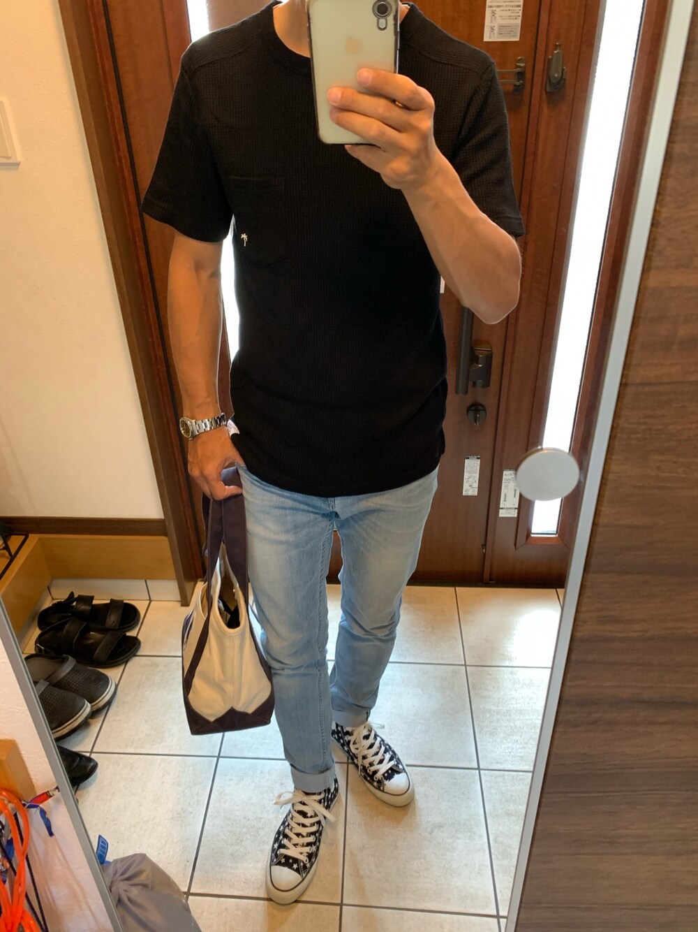 夏コーデ ベイフローのワッフルシャツ 足元も黒合わせ 星コンバース