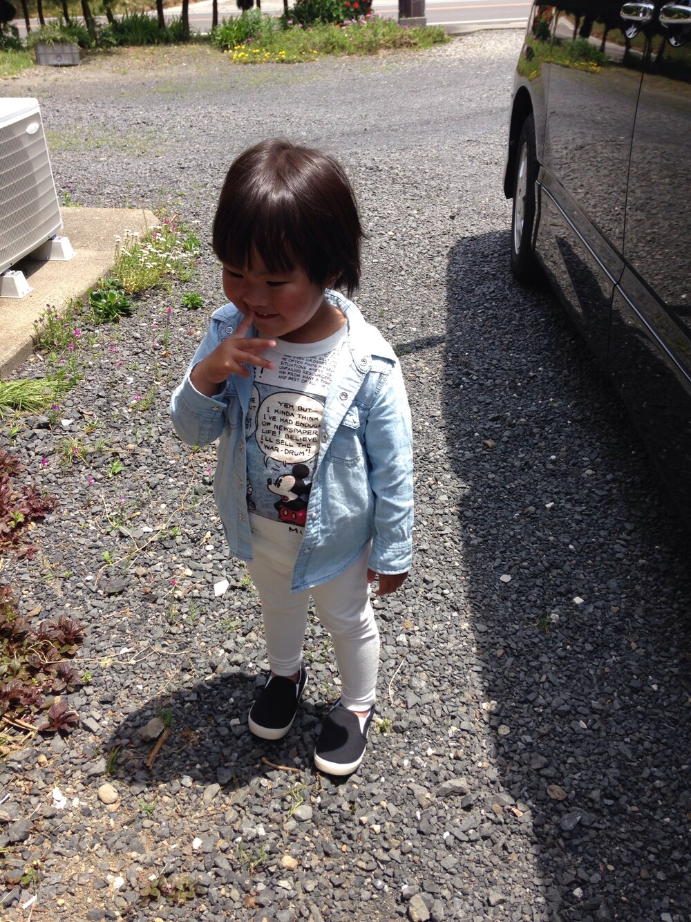 シンプルコーデ♡デニムシャツとブリーズのミッキーTはワタシもオソロイ(*≧艸≦)グローバルワークのこのパンツは本当に履きやすくて娘、こればっかり履きたがる!