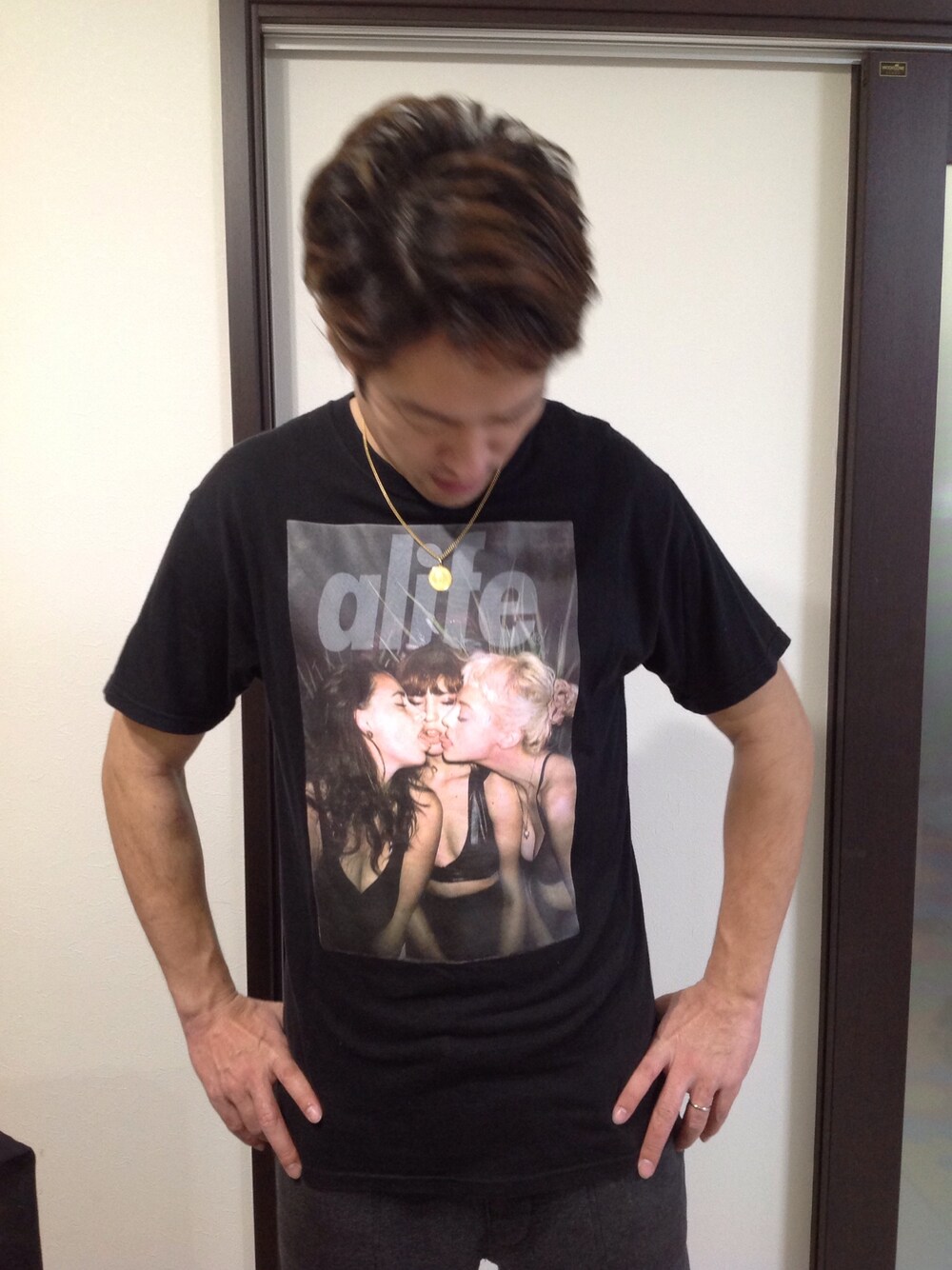 ブラック系のTシャツ/カットソーを着用したメンズの夏コーディネートの1枚目の写真