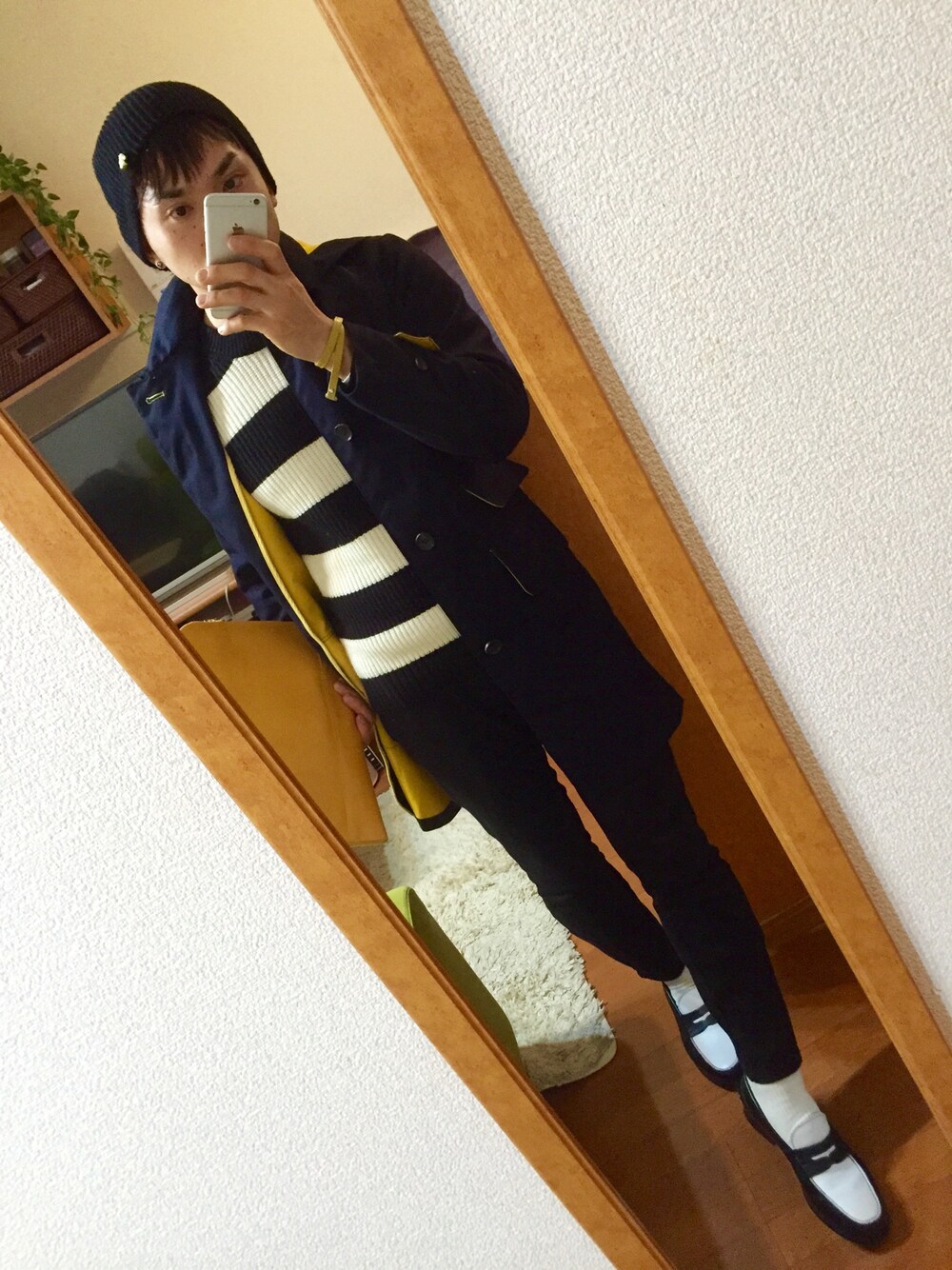 ネイビーのチェスターコート。 裏地とフードの内側が発色の良いイエロー。 一目惚れして即ゲットしました❤️ ラインもとても綺麗です。 インナーのボーダーと合わせて白黒でまとめました。 昨日NARUTOの最終巻見つけて、集めてないけど買いました。面白かった〜〜。 諦めないで頑張ろうと思わせてくれます。