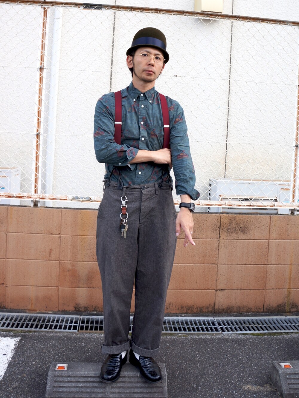-サスペンダー- まだまだ10月コーデ。 柄シャツにサスペンダーそして ボーラーハット‼︎ 自分の定番の組合せ☆