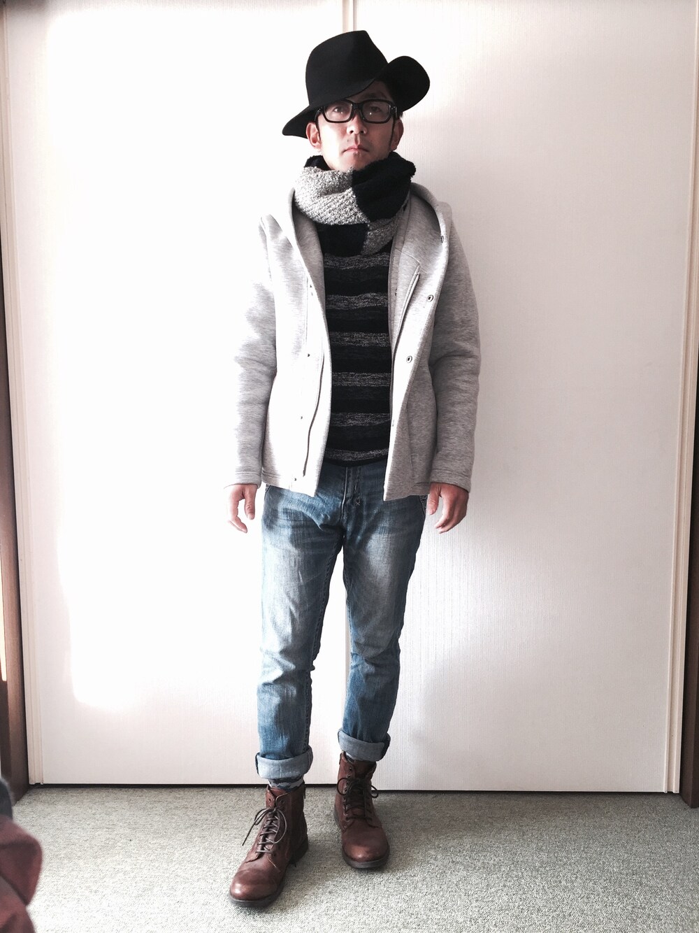 おはようございます^o^ 今日はボーダーのニットにパーカーを合わせて、スヌードで首元にアクセント。