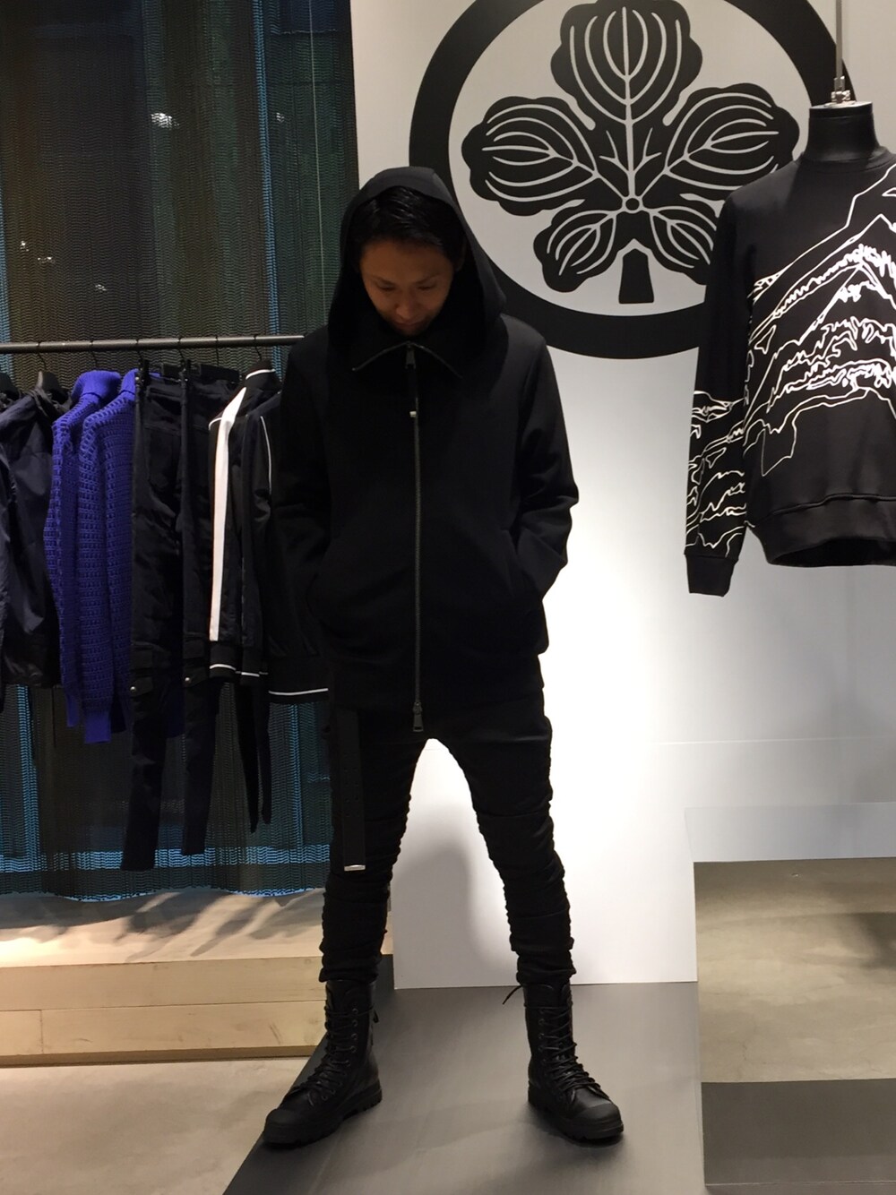 ブランドイメージに沿った忍びスタイル。だが、現代に溶け込むようにスポーティーなスタイリング。全身黒なので分かりにくいが長めのベルトがアクセント。こちらは二本繋げてアレンジ。