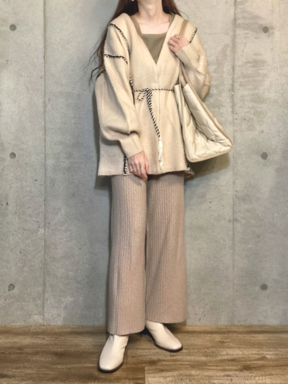 エリーのカーディガン/ボレロ「紐付き配色ステッチニットガウン/カーディガン」を使ったコーディネート