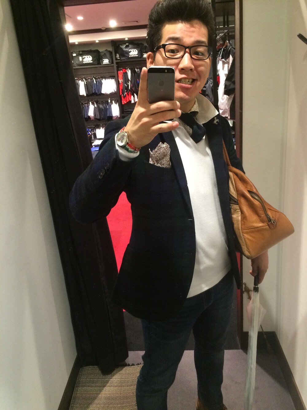 ジャケットはTEIJIN MEN’S SHOPで見つけたMOONのブラックウォッチ、ネクタイもウールのブラックウォッチ、 だが…写真だと柄が全然見えない!!! なんなんだ!どうしたらいいんだ!