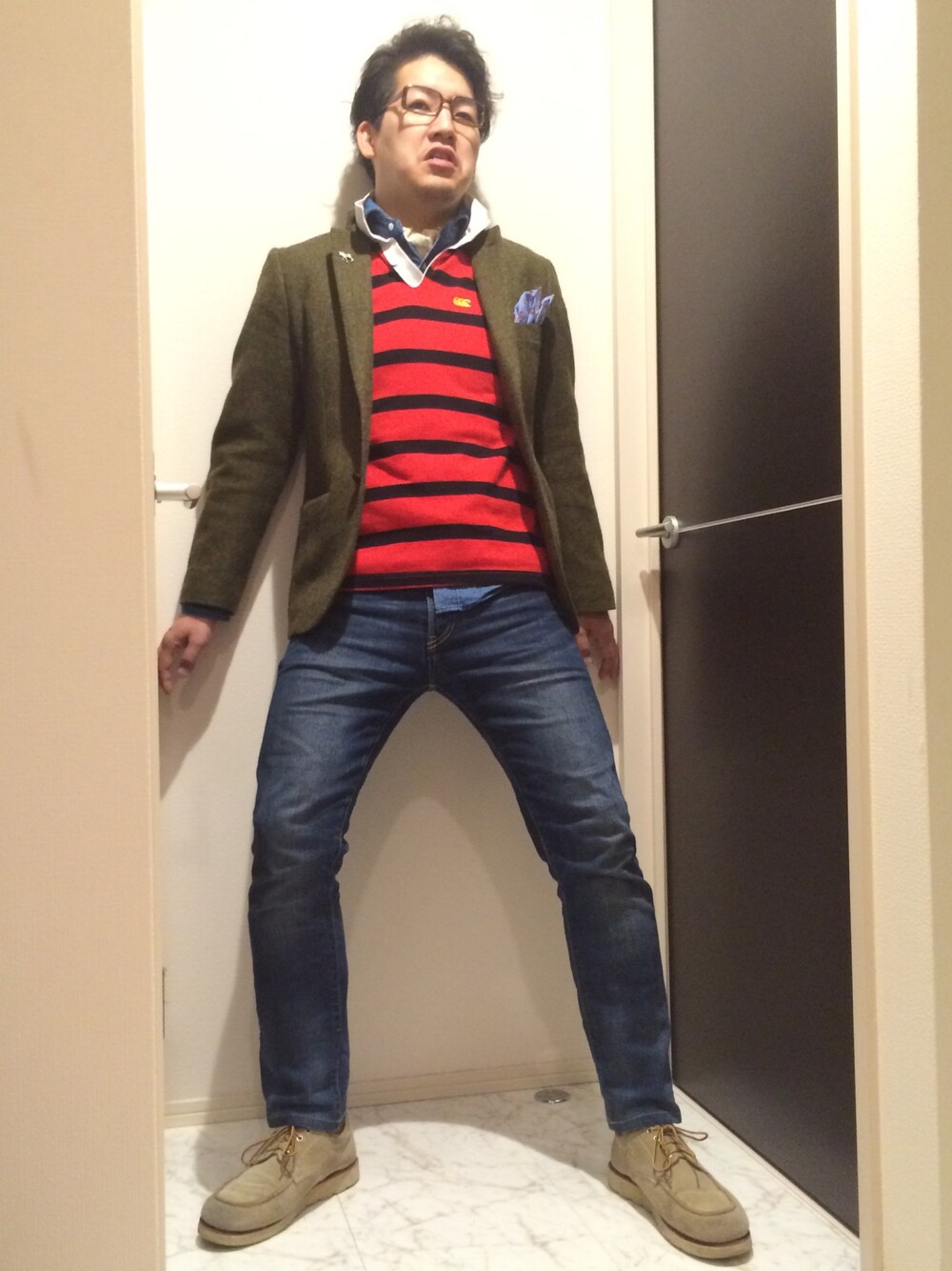 壁に追い詰められたポーズ! デニムシャツにアスコットタイでアウトドアな感じにしたかったが、見れば見る程そうでも無い(´・ω・`) 落ち着いた色味のラガーシャツとハンティングジャケットが欲しい…