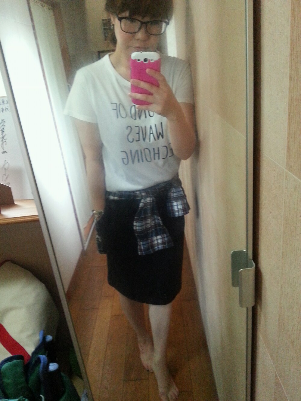 ☆Tシャツ ☆スエットスカート ☆青チェックネルシャツ ☆メガネ ☆ヘアアレンジ