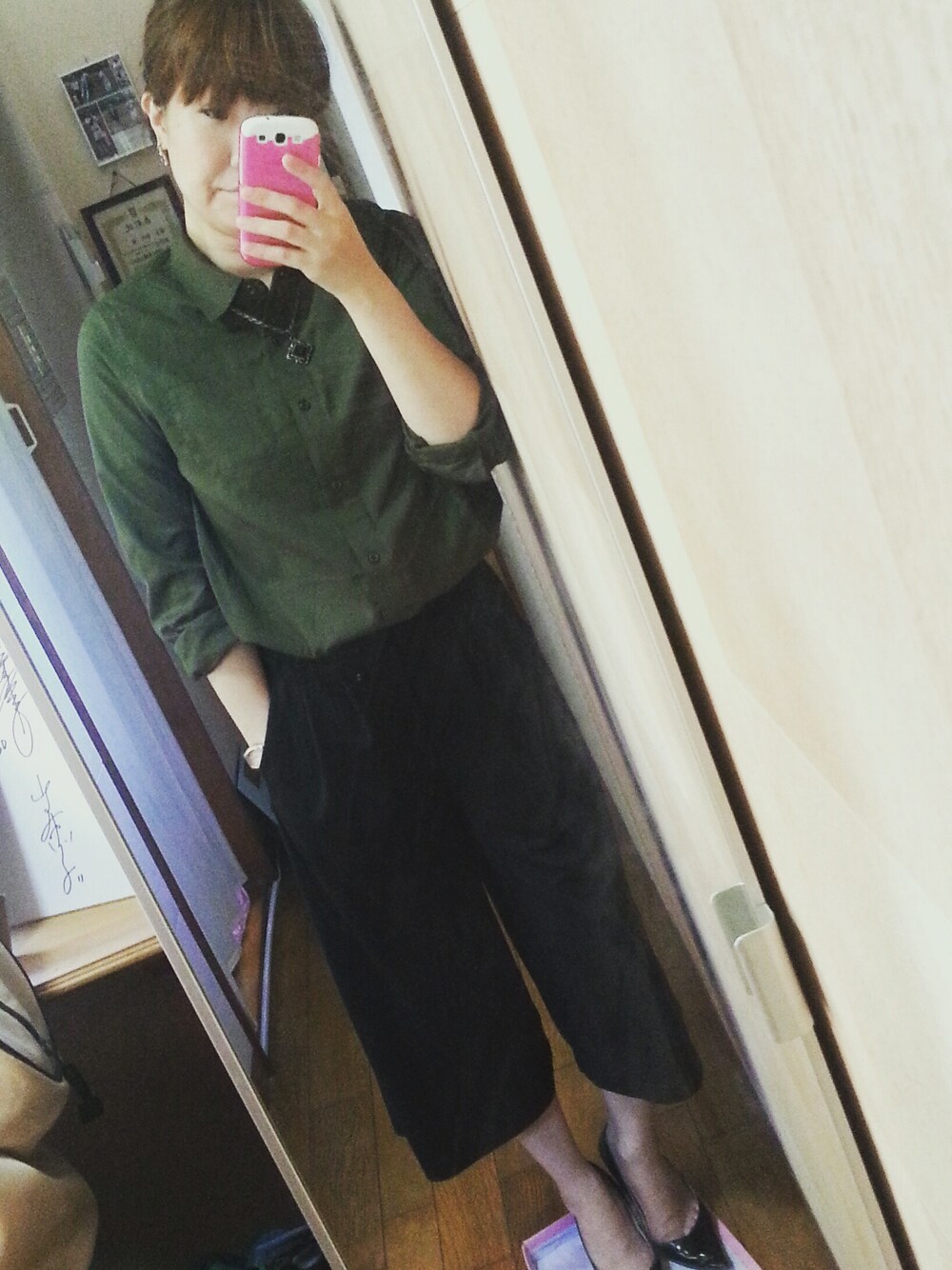 ☆ガウチョパンツ ☆カーキシャツ ☆ネックレス ☆パンプス ☆ヘアアレンジ