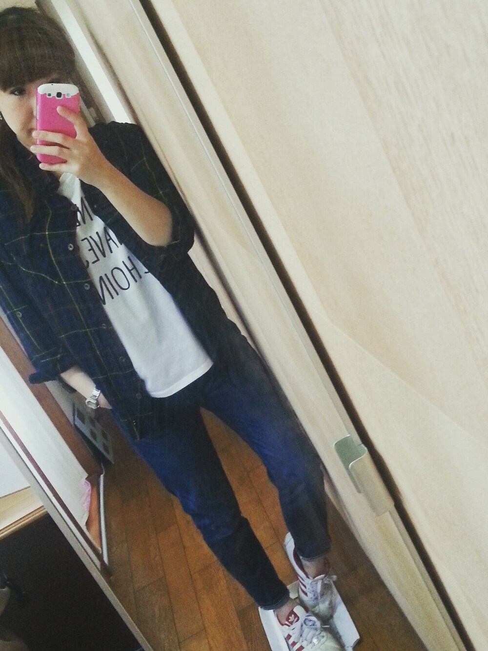 ☆グリーンチェックシャツ ☆デニムパンツ ☆Tシャツ ☆スニーカー