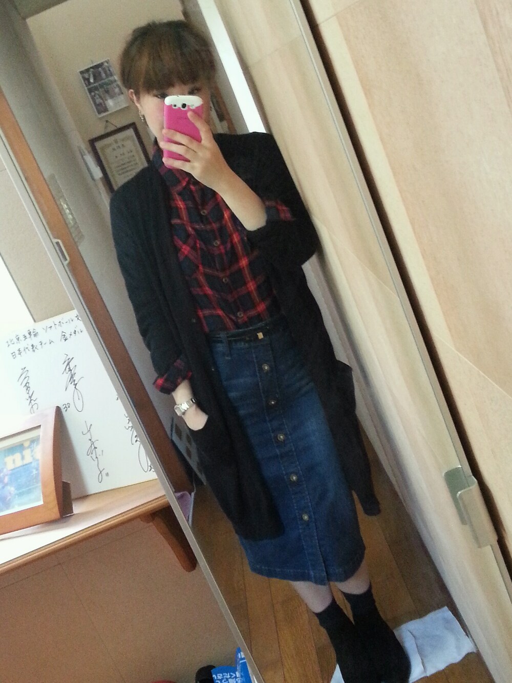 ☆ネイビーロングガーデン ☆チェックシャツ ☆デニムスカート ☆サイドゴアブーツ ☆ヘアアレンジ