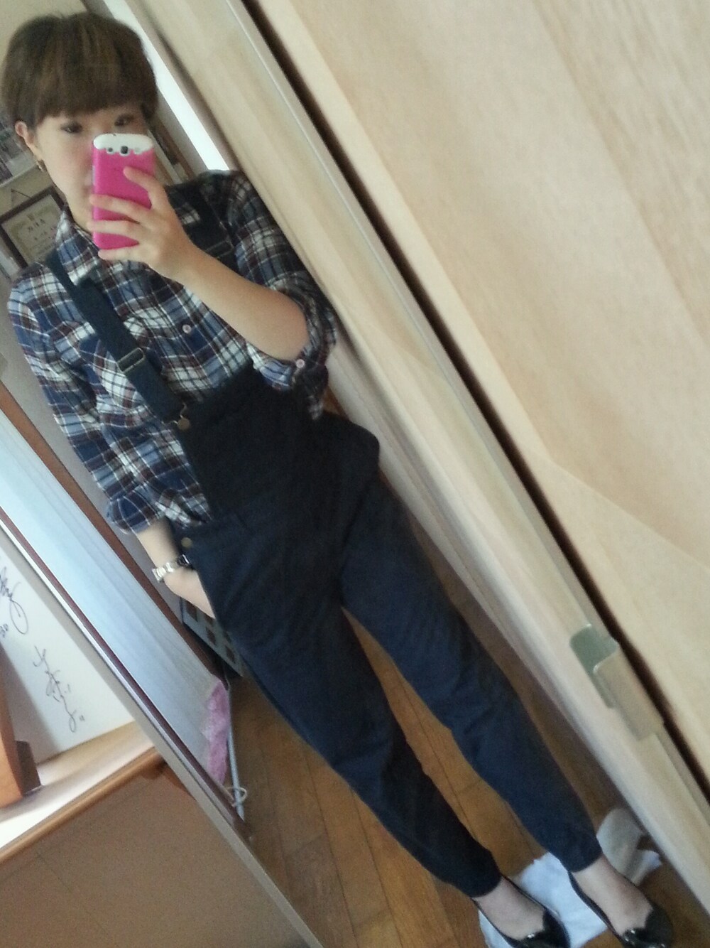 ☆チェックネルシャツ ☆ネイビーオーバーオール ☆パンプス ☆ヘアアレンジ