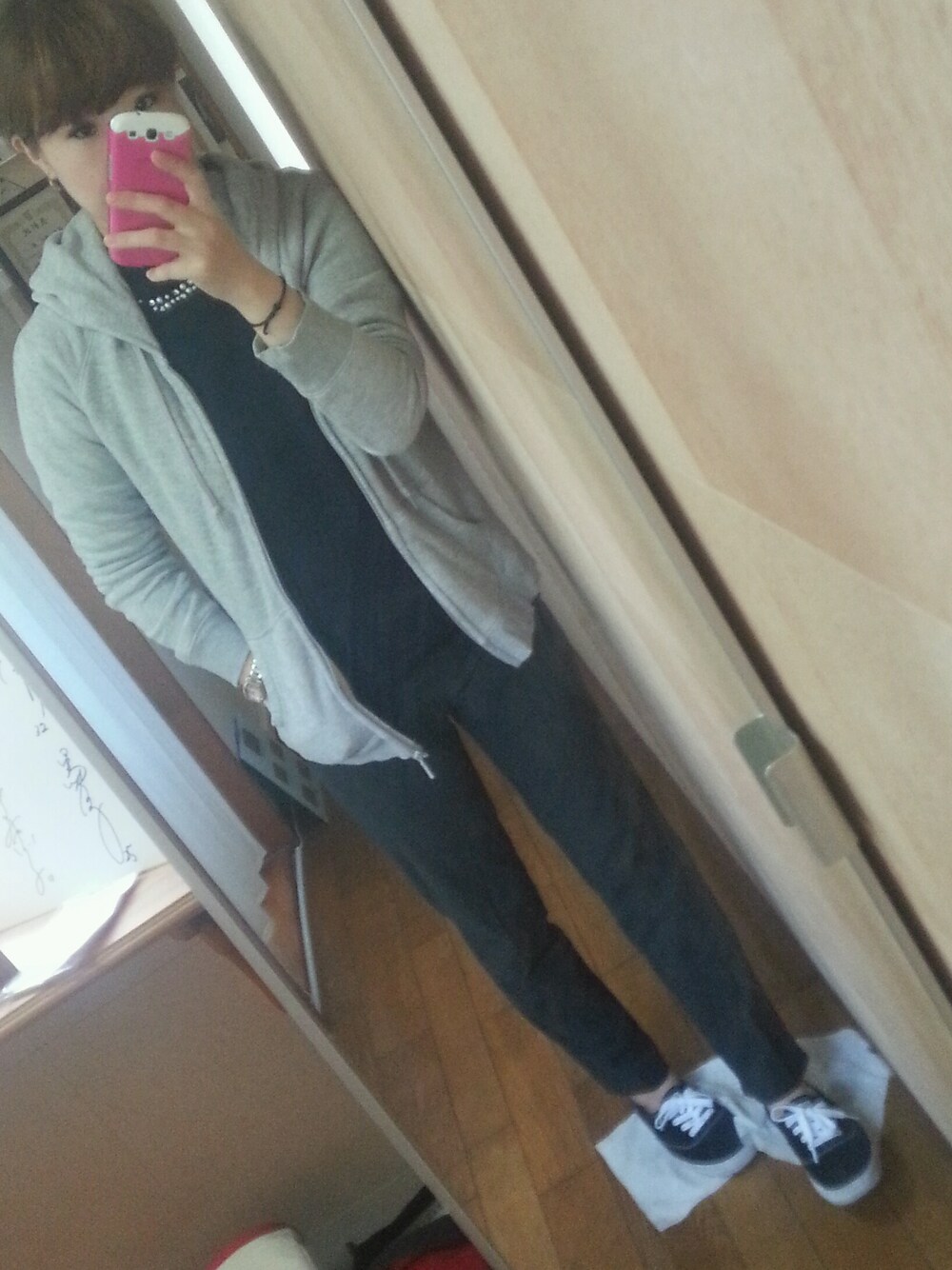 ☆グレーパーカー ☆ビジュー付ネイビーニット ☆グレーパンツ ☆スニーカー ☆ヘアアレンジ