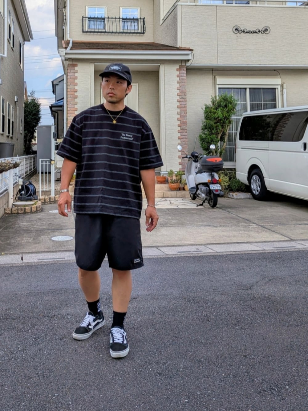 さりげにローラーブレード滑れます⛸️ エンノイ上下に汗かいても気を使わないネイバーフッドのキャップとVANSのオールドスクールを採用。ソックスもネイバーフッド。 初の手持ちボーダーTシャツはエンノイ、ショートパンツもエンノイ。ネイバーフッドに比べるとやや丈が長く裾が細いシルエット