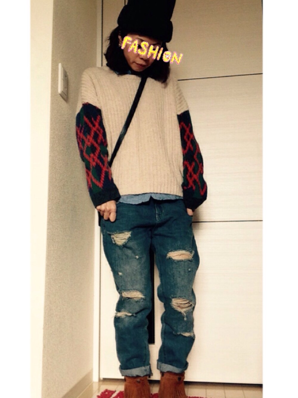トップス:KBF ダメージデニムパンツ:Sonny Label 靴:ミネトンカ ニット帽:URBAN RESEARCH ニット暖かくて、柄もお気に入り♡