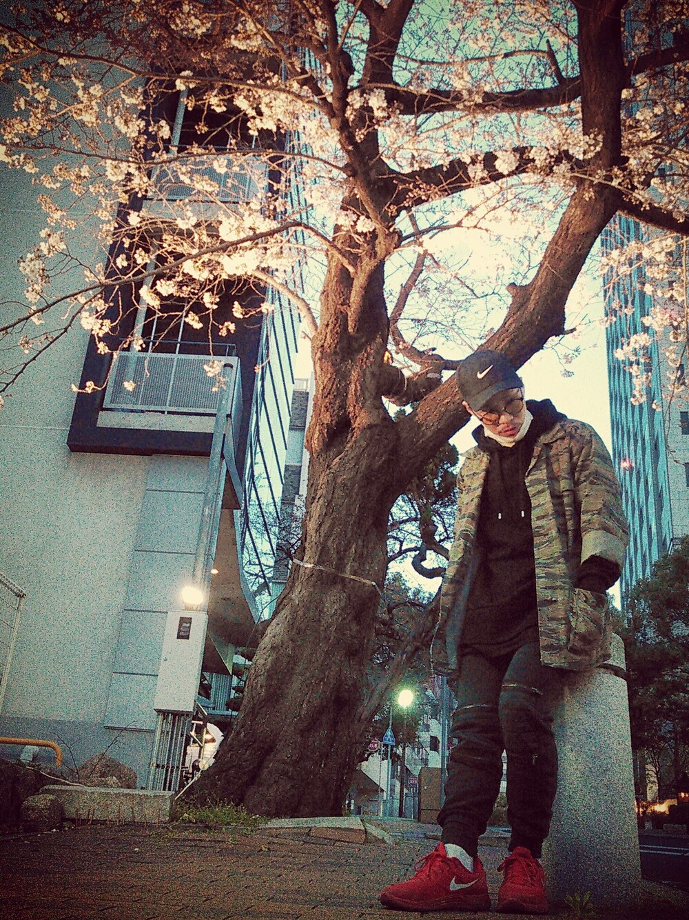 レッド系のスニーカーを着用したメンズの春コーディネートの1枚目の写真
