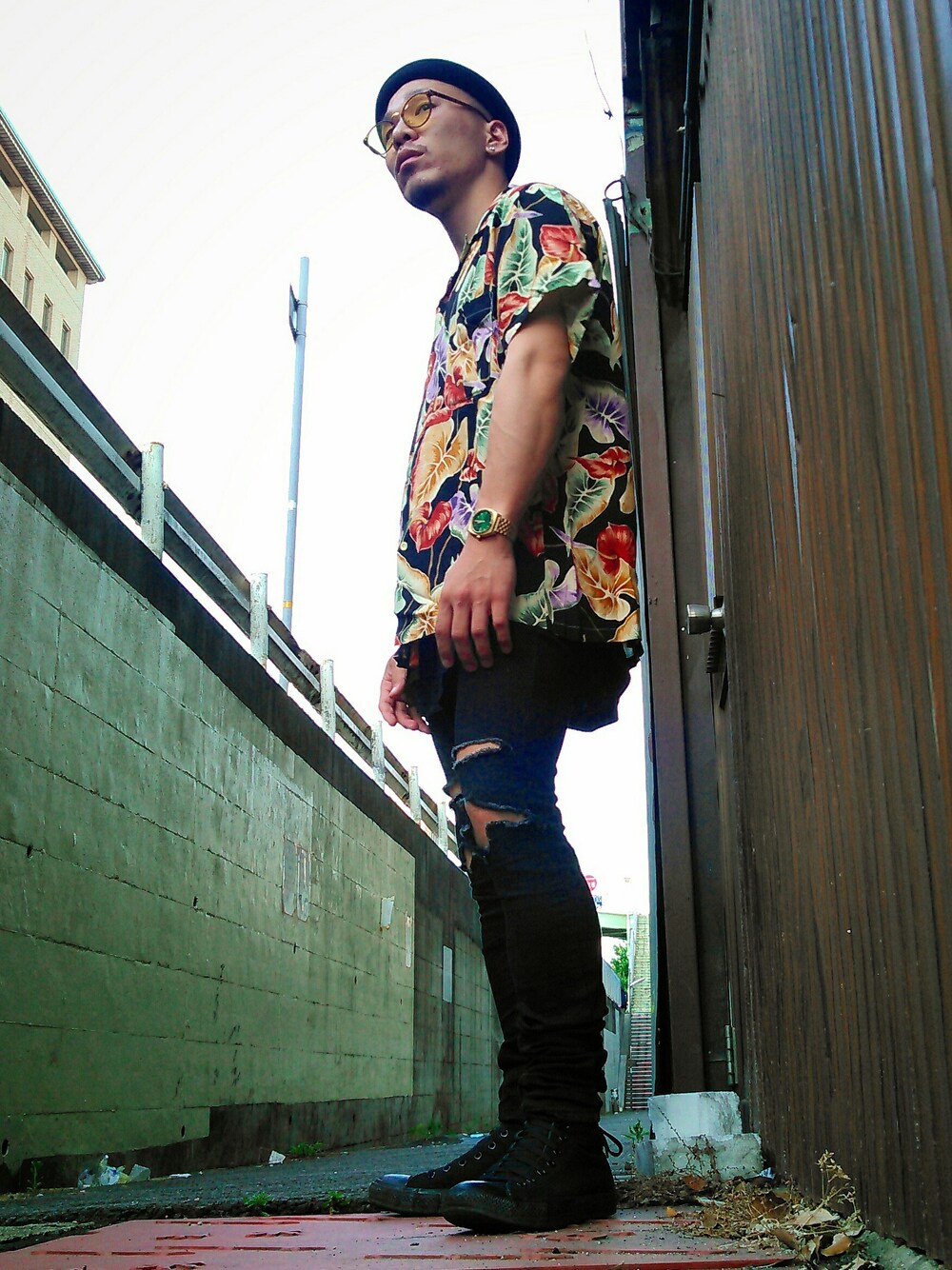 ブラック系のシューズ、ゴールド系のアナログ腕時計を着用したメンズの夏コーディネートの1枚目の写真
