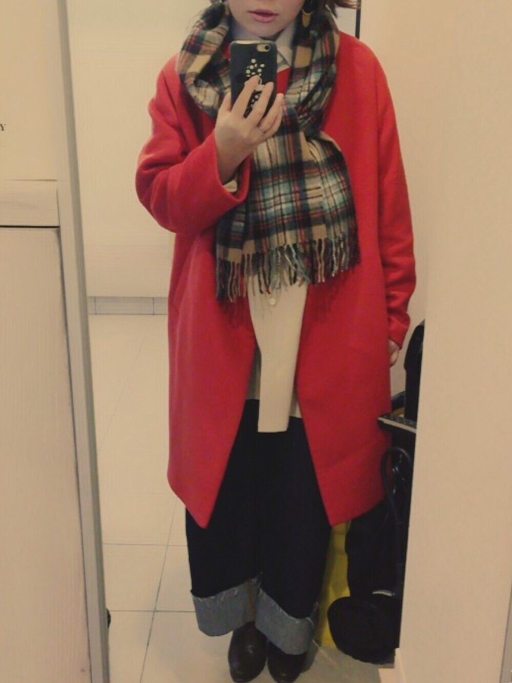 この赤いコート一目ボレして購入してヘビロテです♡ シャツも胸元にでっかいポケットと、袖長く、ビッグシルエットが可愛い♡😍