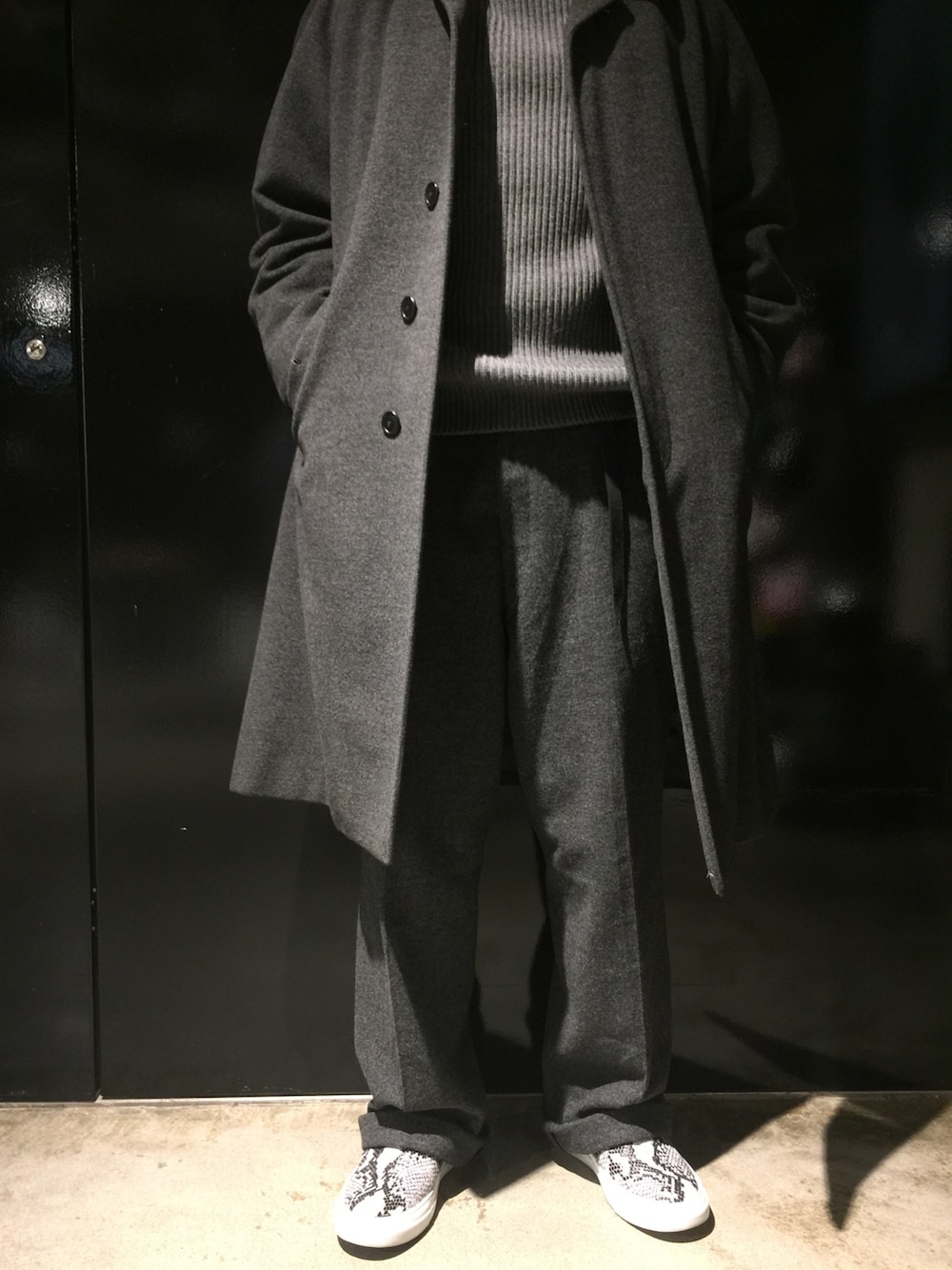 オールグレーのコーディネイトです。 Aラインのステンカラーコートとウールのワイドスラックスのバランス感と色味の統一感を意識してます。 足元はグレーでも、パイソン柄をチョイスしてハズしてます。
