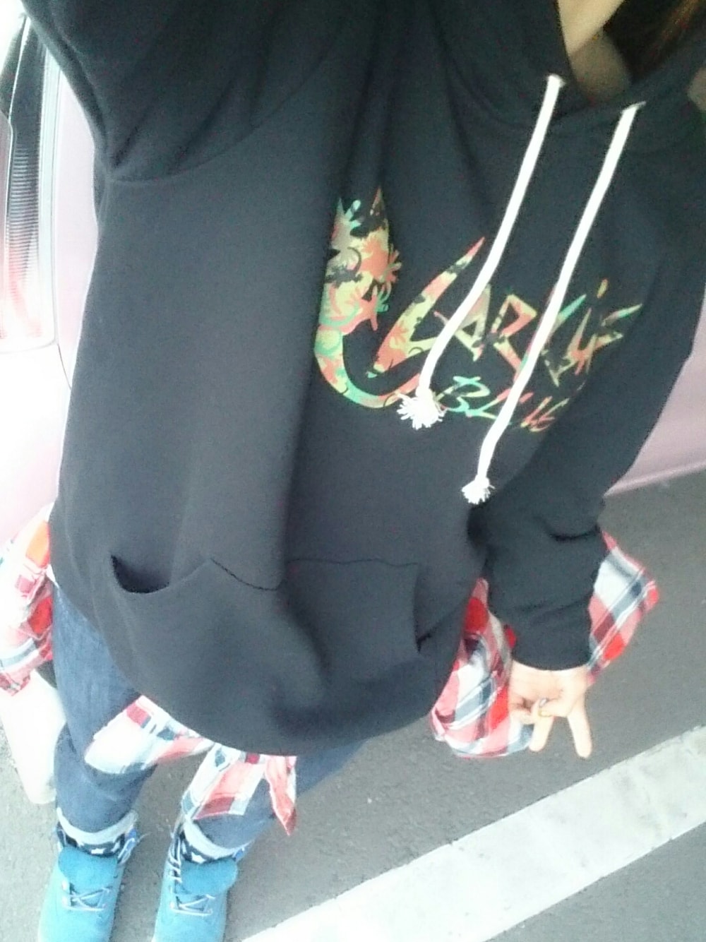 あえての4L😂 4Lとか初めて買った(  ̄▽ ̄)笑 なんか知らんけどドキドキした(/´△`\)笑 でもこのブカブカ感好き~❤ んでもって、風吹きすぎて腰にまいてるネルシャツぶわぁってなってる笑