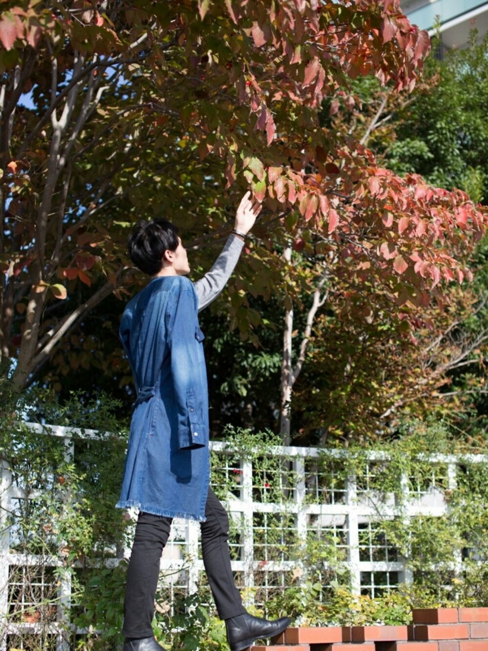 夜勤明けの撮影。 薄手のデニムコートに薄手のニット。スキニーにサイドゴア。 葉っぱが色付いてる🎵 いいね、セーブ、フォローありがとうございます‼
