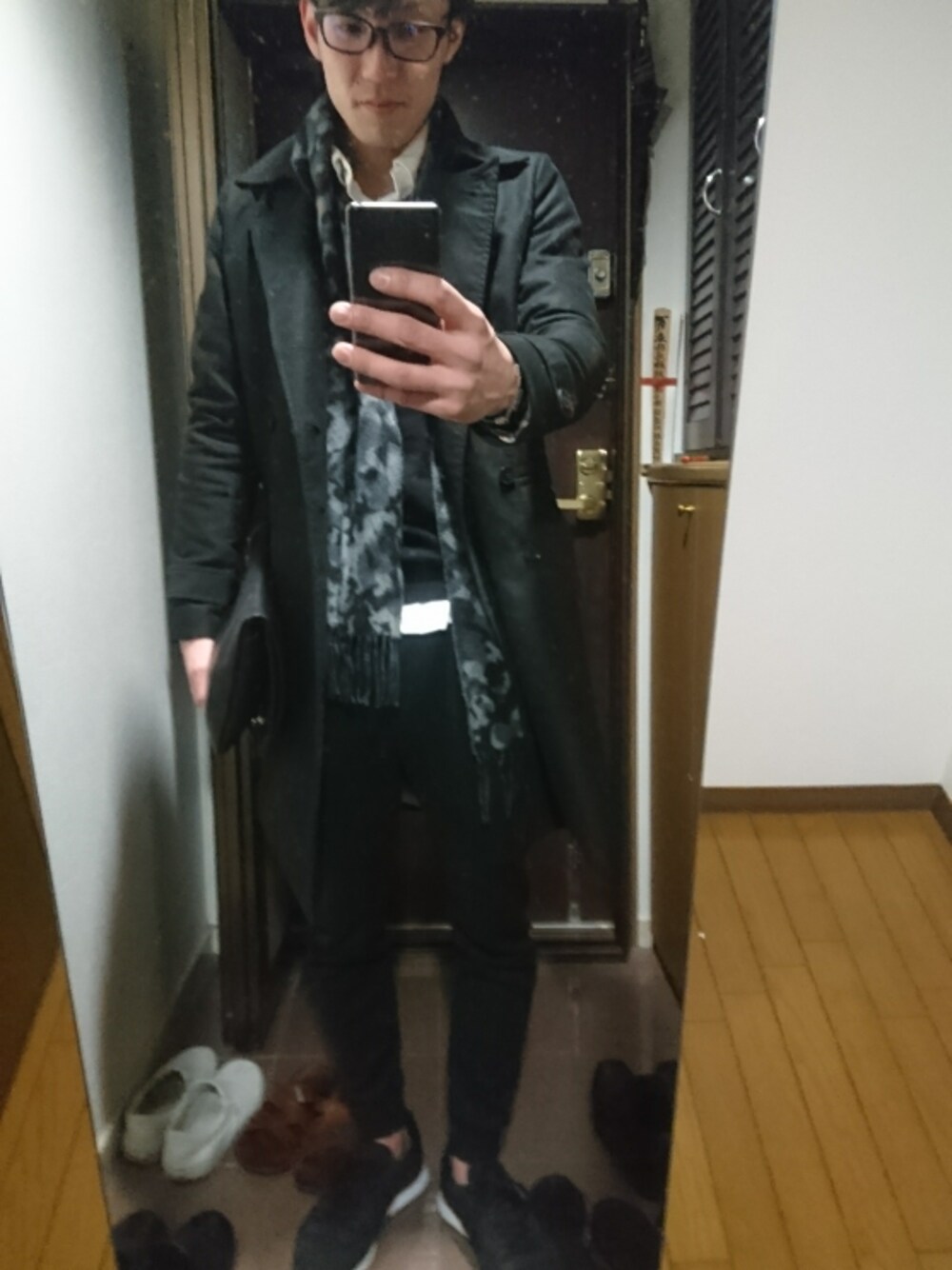 このコート一目惚れ😏キメキメになるからスポーツウェアで外してます‼ コートを脱いでも外しすぎにならないようにニットにシャツです‼ いいね、セーブ、フォローありがとうございます‼ wear kansai