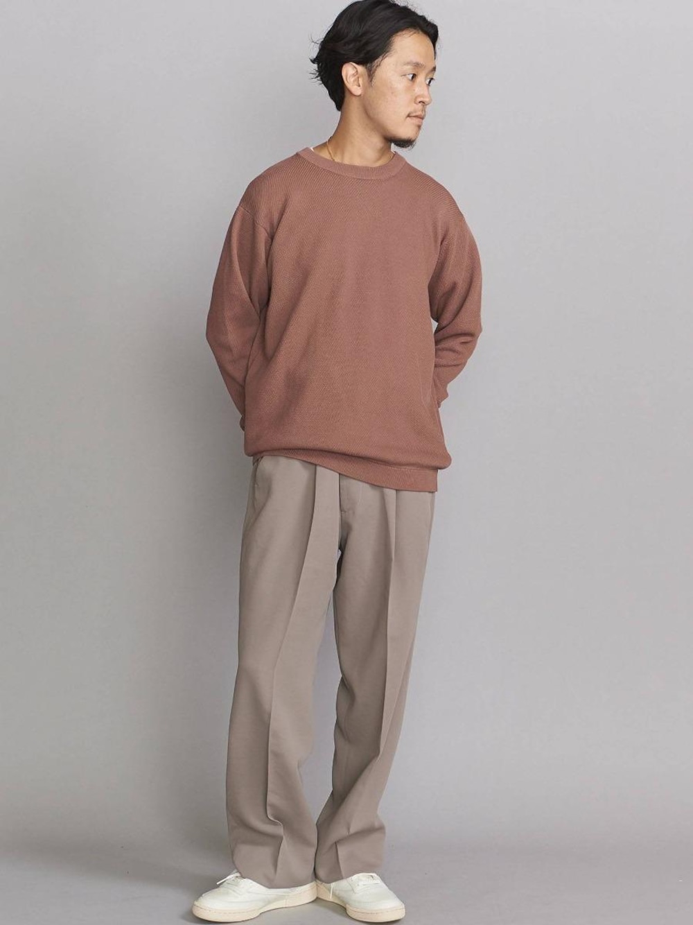 ・身長172cm ・体型 痩せ型 ・【トップス】主張し過ぎない程よい織り感。ややゆとりのあるシルエット。【パンツ】ポリエステル素材でイージーケア。光沢感もあり上品な雰囲気。緩めのシルエット。・コーディネートポイント 秋らしい色味で全体トーンをまとめました。トップスとパンツの風合い良く綺麗な色合いが引き立つようなシンプルなコーディネートです。