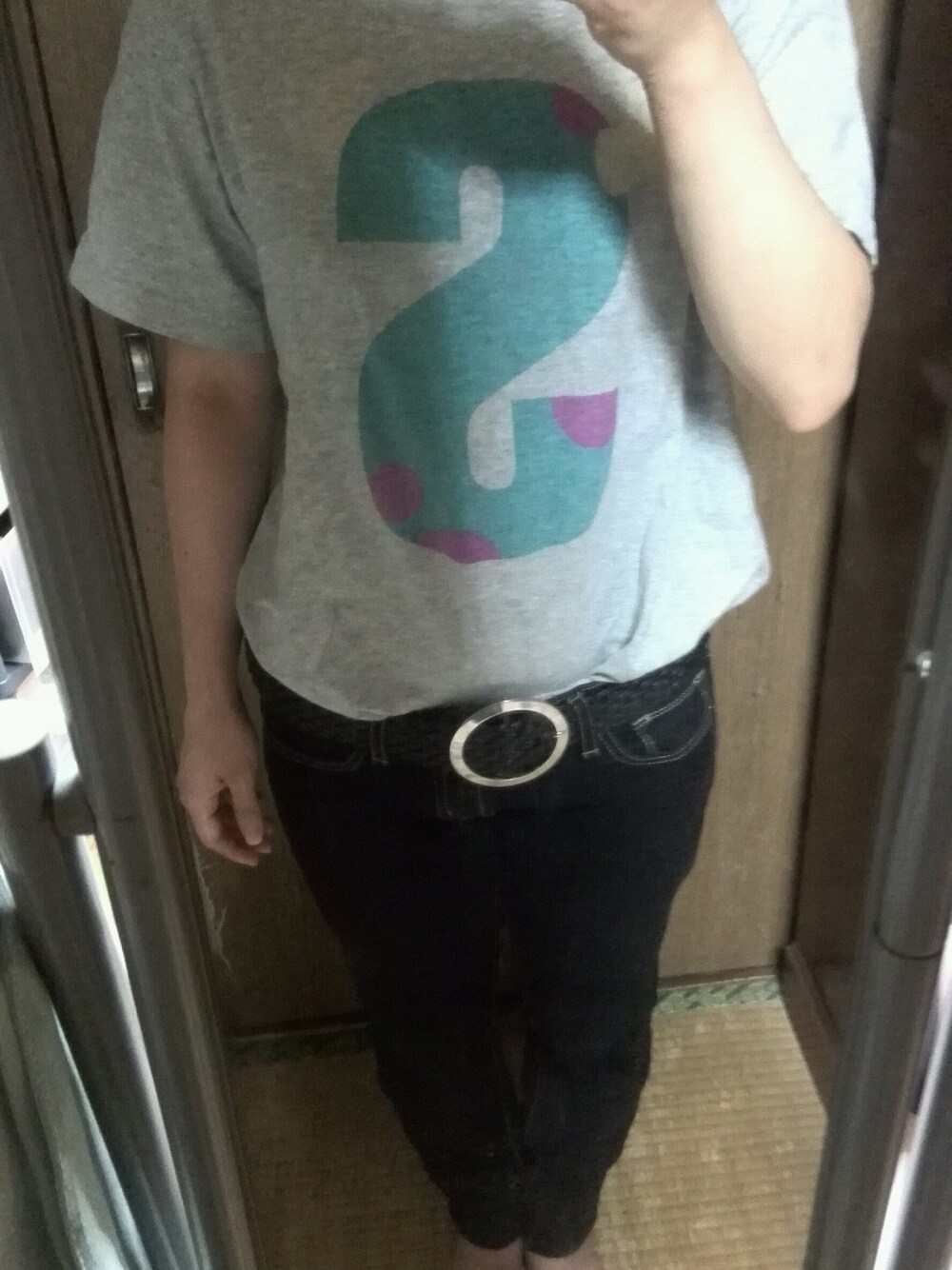 Tシャツがポイントで、ズボンは黒でまとめました! あとはニット帽は淡いピンクにしたら、カジュアルコーデの出来上がりです(笑)