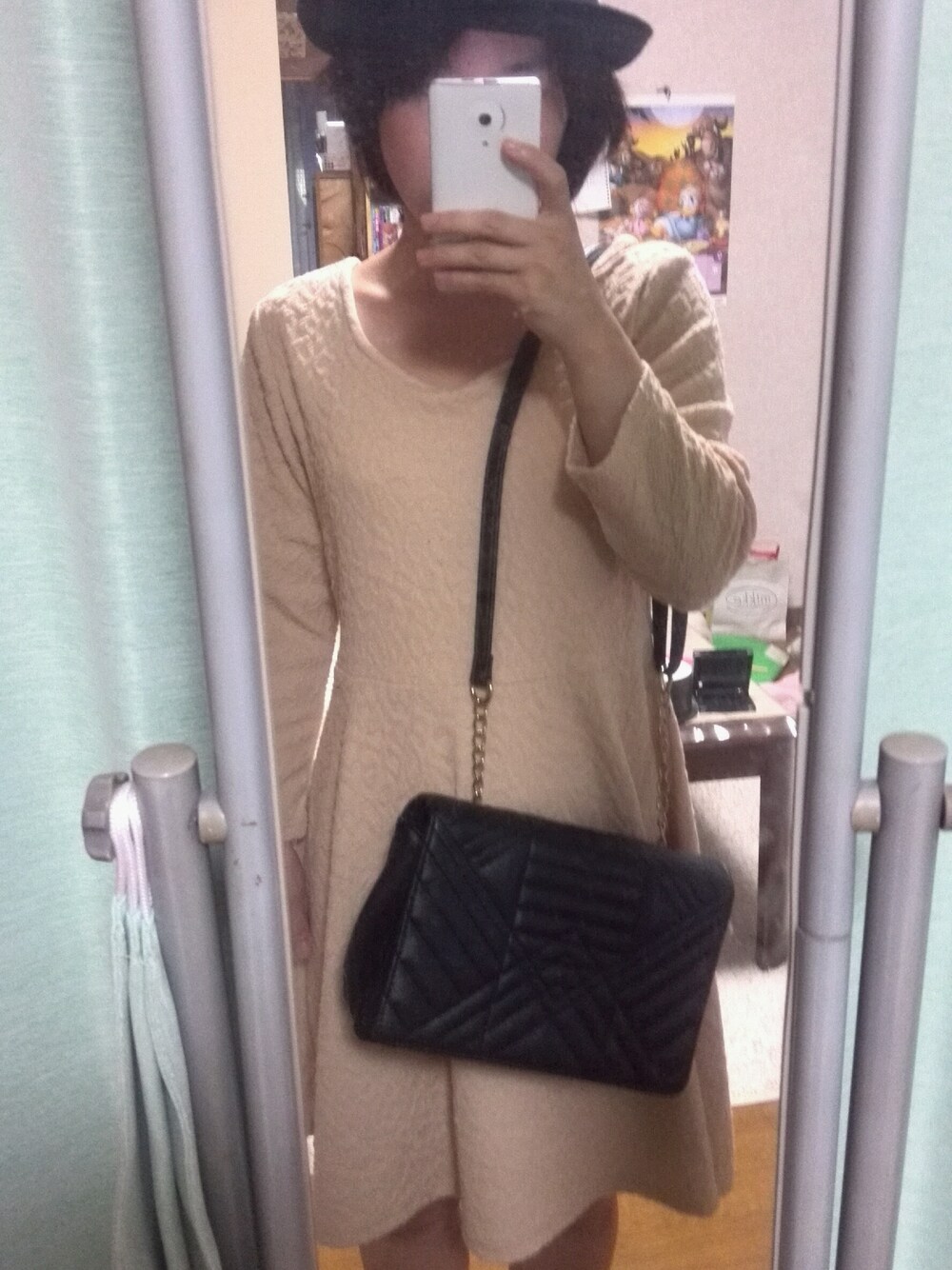 ベージュのワンピで大人コーデ!! 帽子と鞄が黒にしてみたら、意外と似合ったので、こんなコーデにしました(笑) すべて古着屋買いました(♡˙³˙)