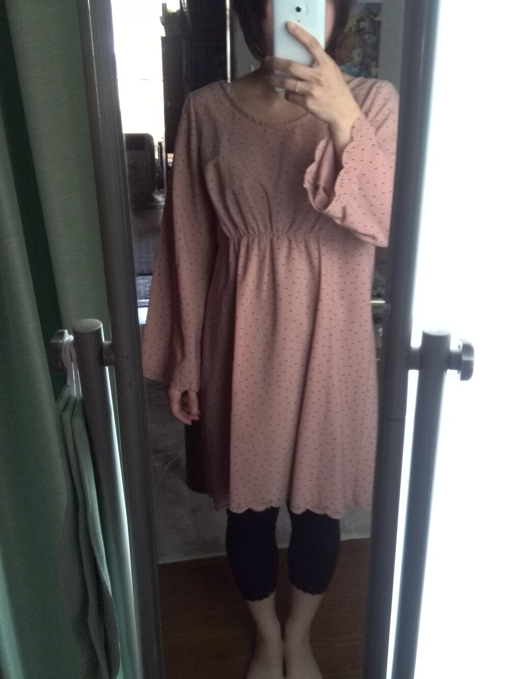 ピンク系のワンピースを着用したレディースの秋コーディネートの1枚目の写真