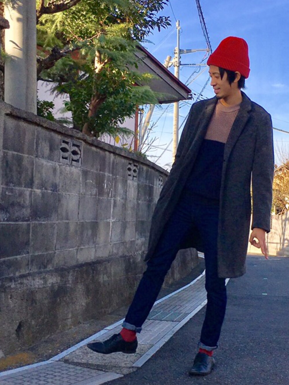赤ニット帽で 差し色を。 シンプルコーデ!
