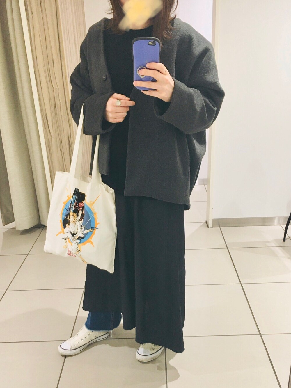 真っ黒ですが歩くと揺れるワンピの裾で女子感アップです👯♀️❣️ GUの最高のニット、色違い2枚目購入です🙋🏿♀️🌟