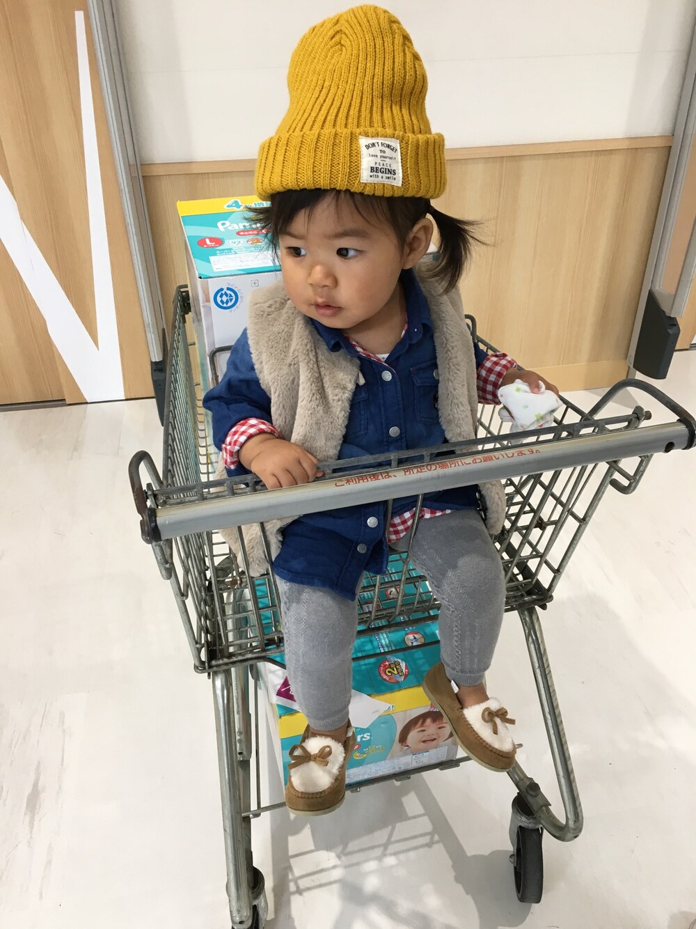 . カートの上から失礼しまーす! 今日は寒いですね😥🍂 朝からオムツをリニューアルオープンした お店で激安でGETしてきました😊✨ . 今日はpetitmainで新しい服もget❤️ 早く着せたいな〜