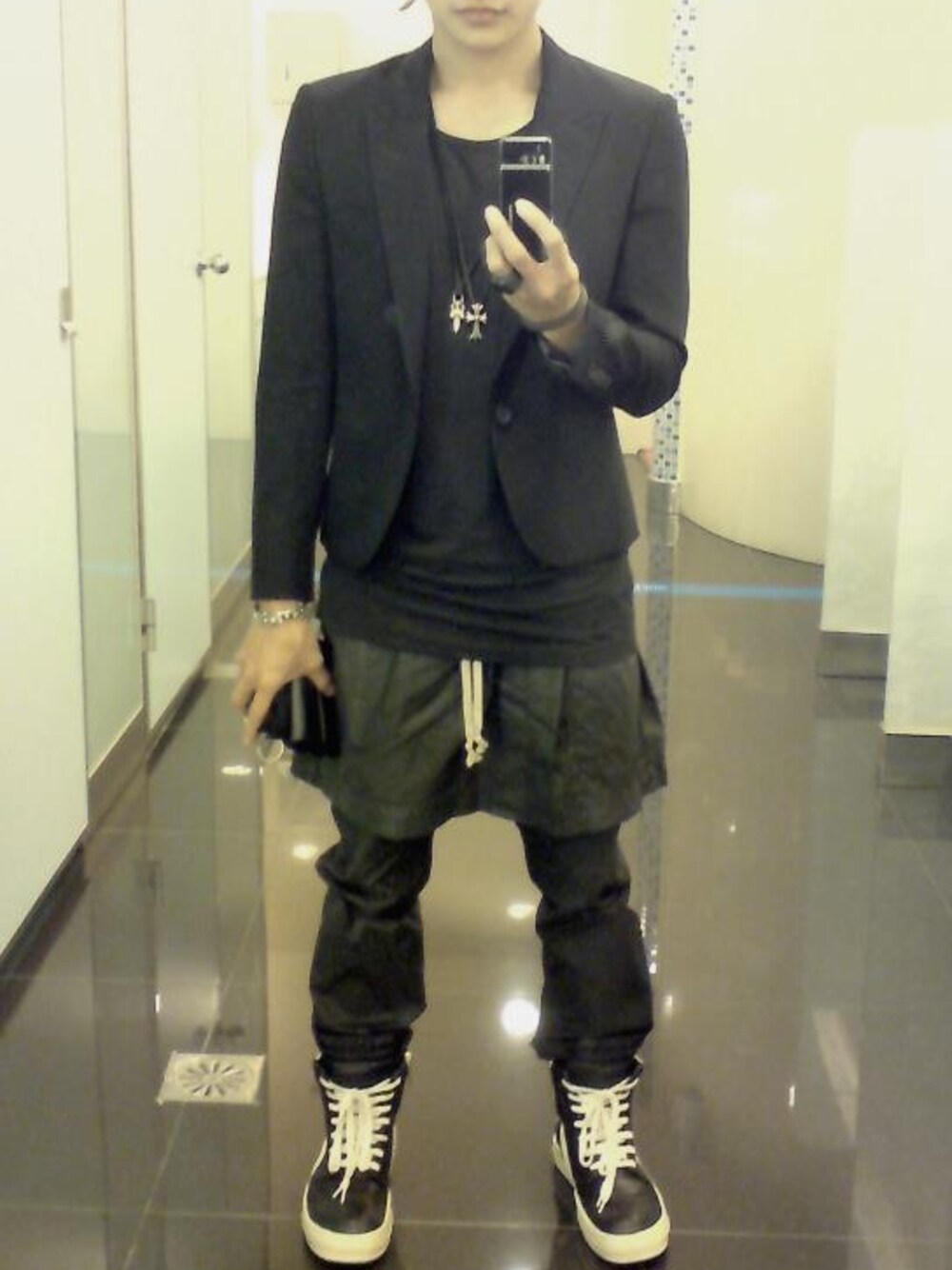 外套:No Brand 褲子:DRKSHDW By Rick Owens 鞋子:Rick Owens 項鍊&手鍊:Chrome Hearts 耳環:Givenchy